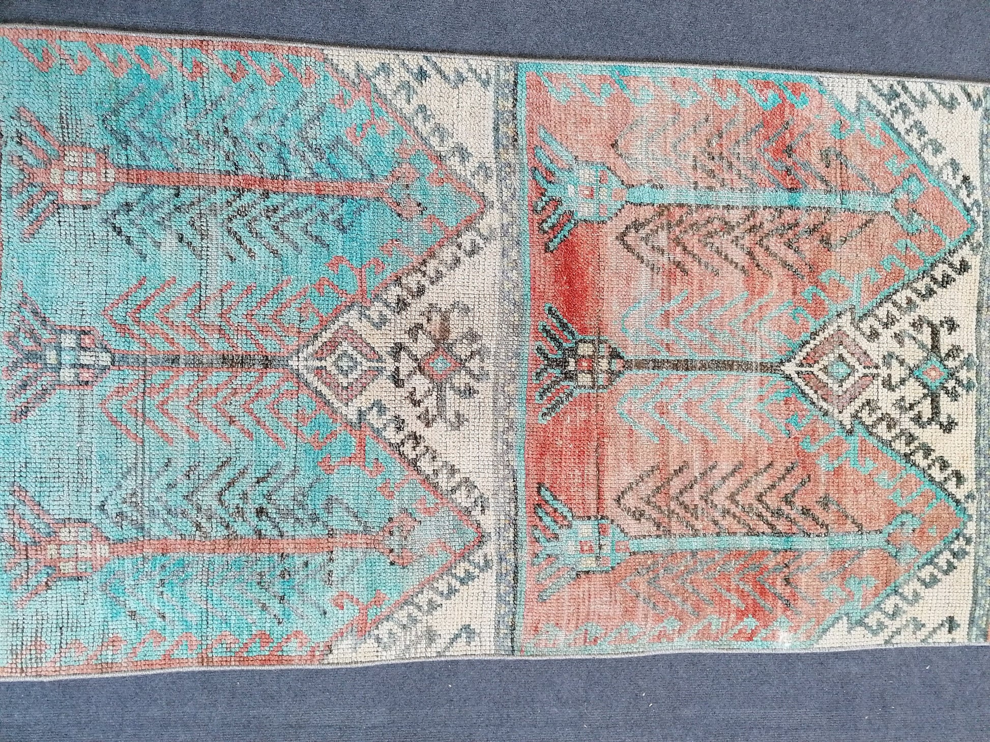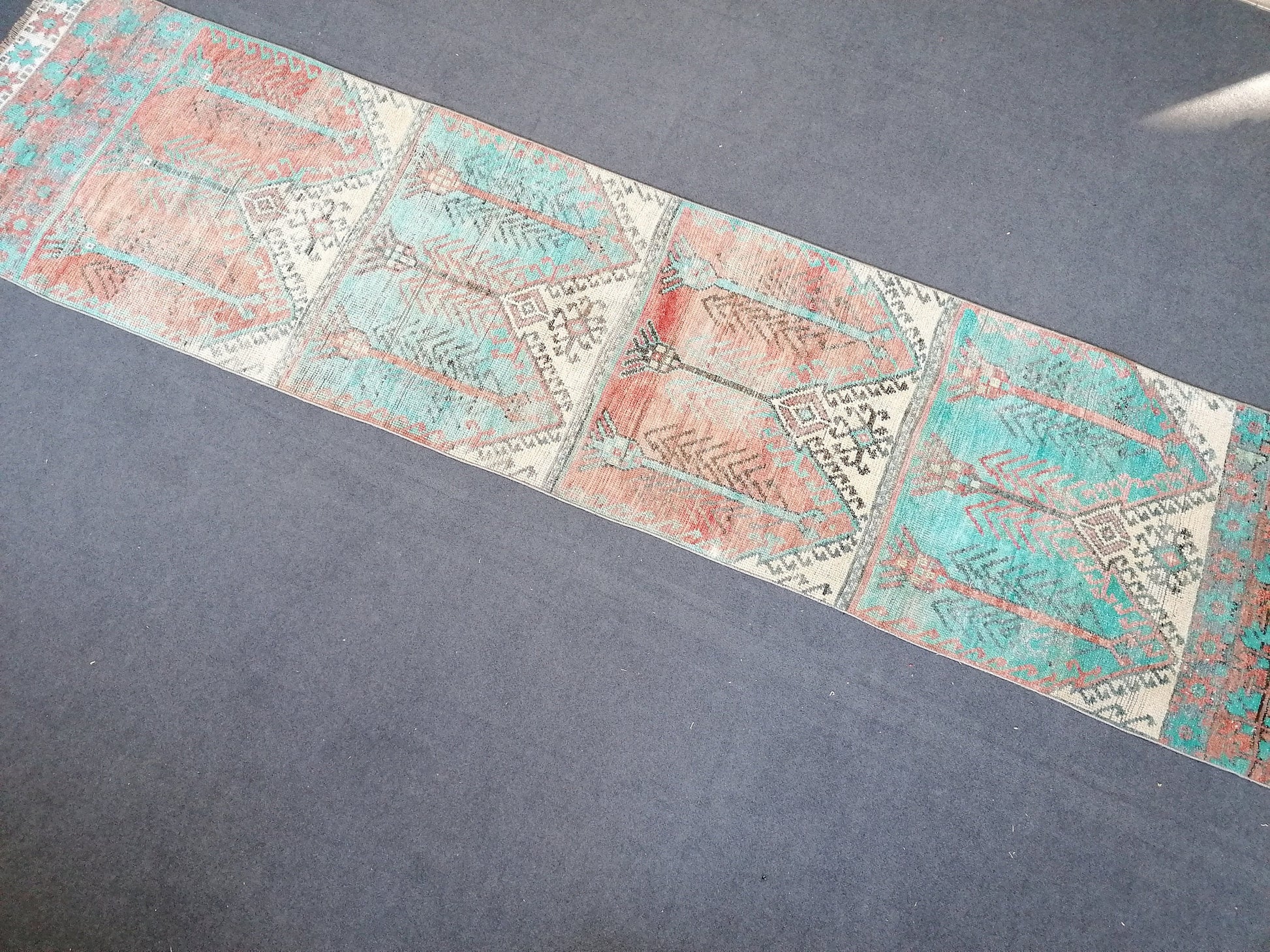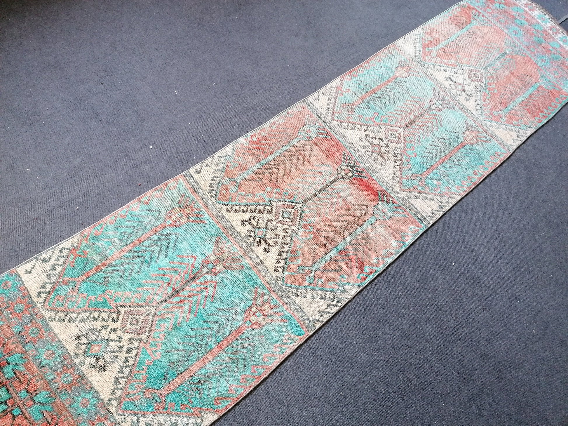 12'x2'11 vintage blue runner rug, vintage hallway runner, vintage kitchen runner rug, vintage anatolian rug