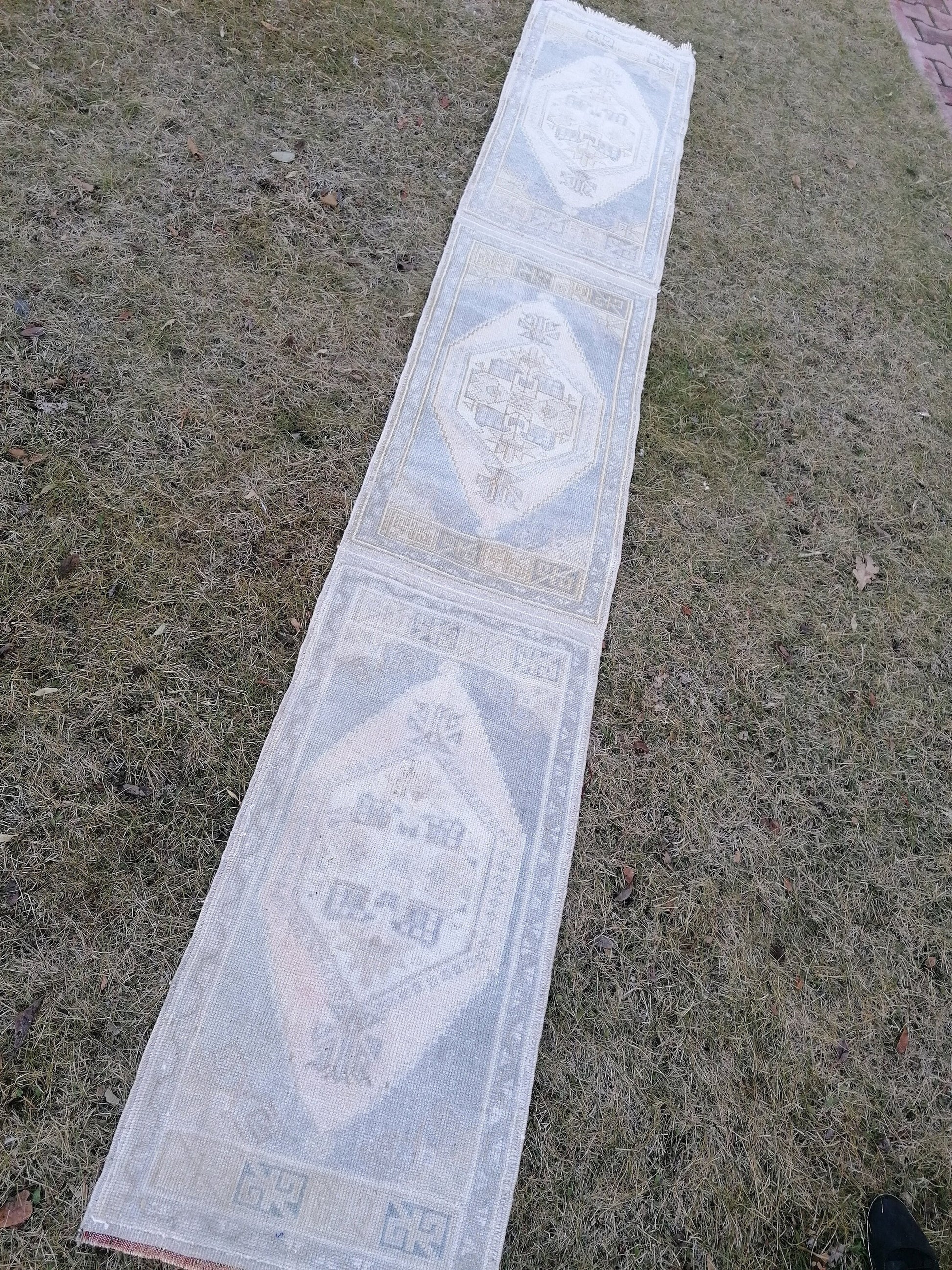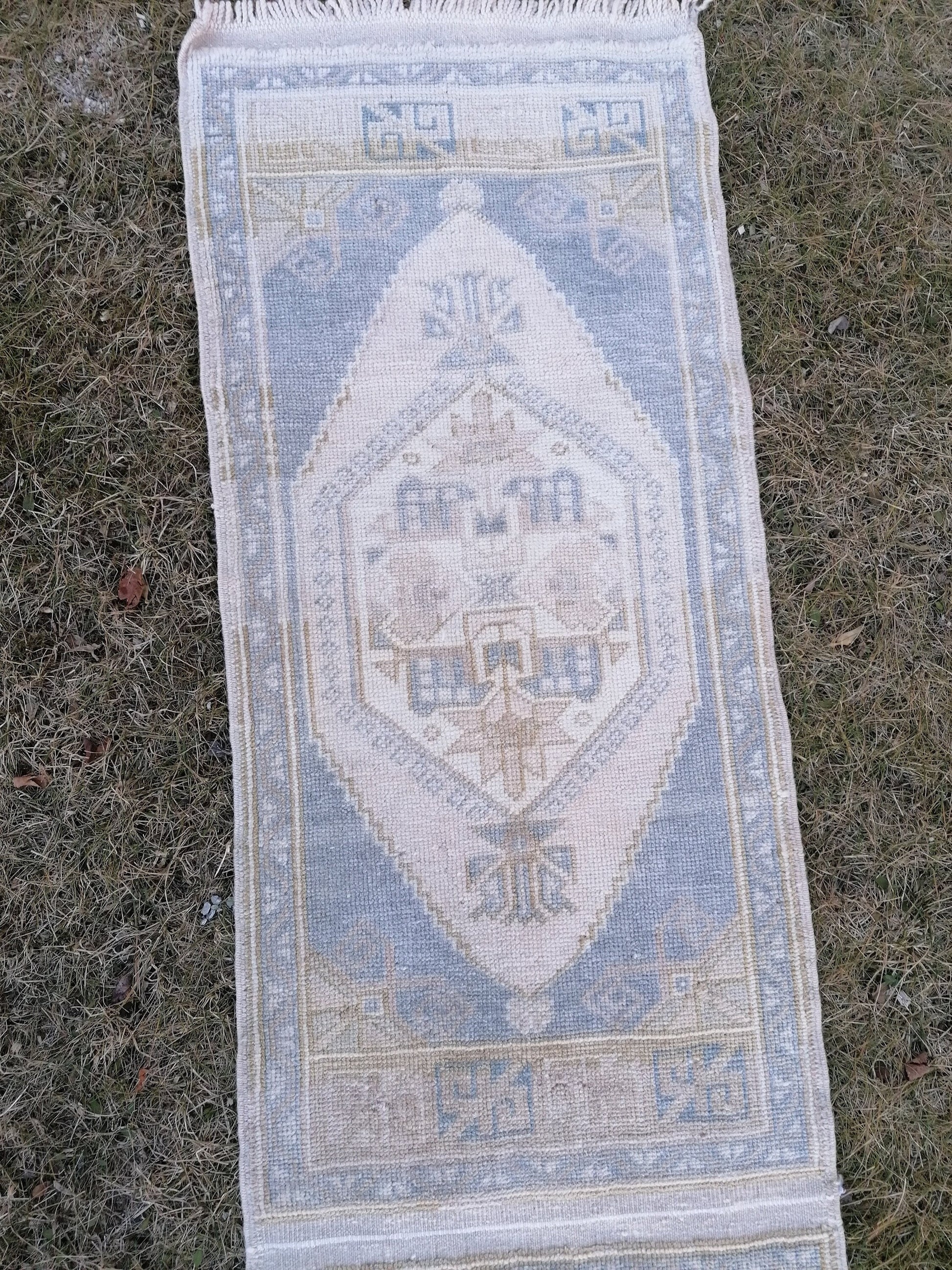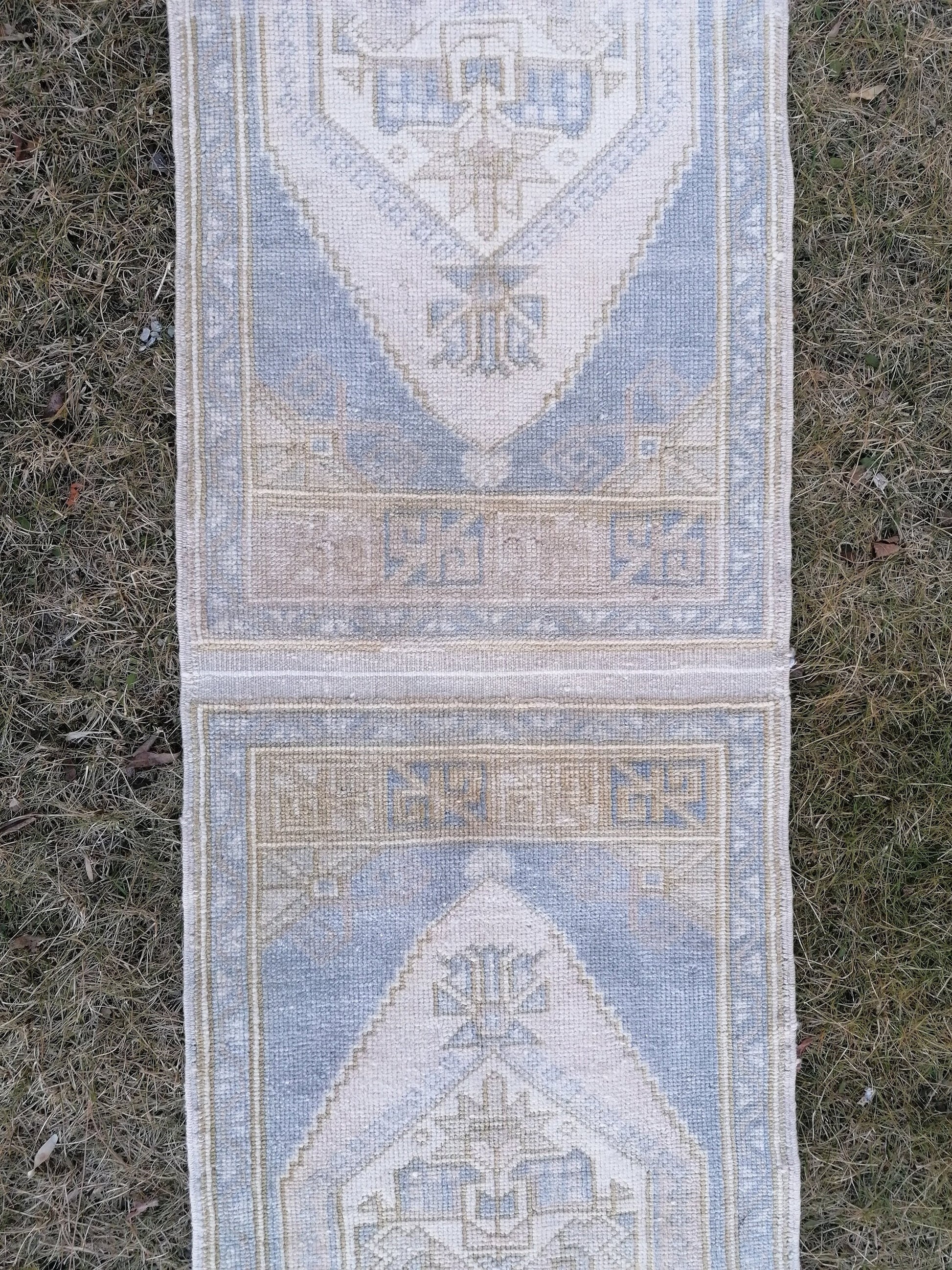 1'9x10'5 muted blue runner rug, faded vintage turkish runner, hallway runner rug, kicthen runner rug, oushak runner rug