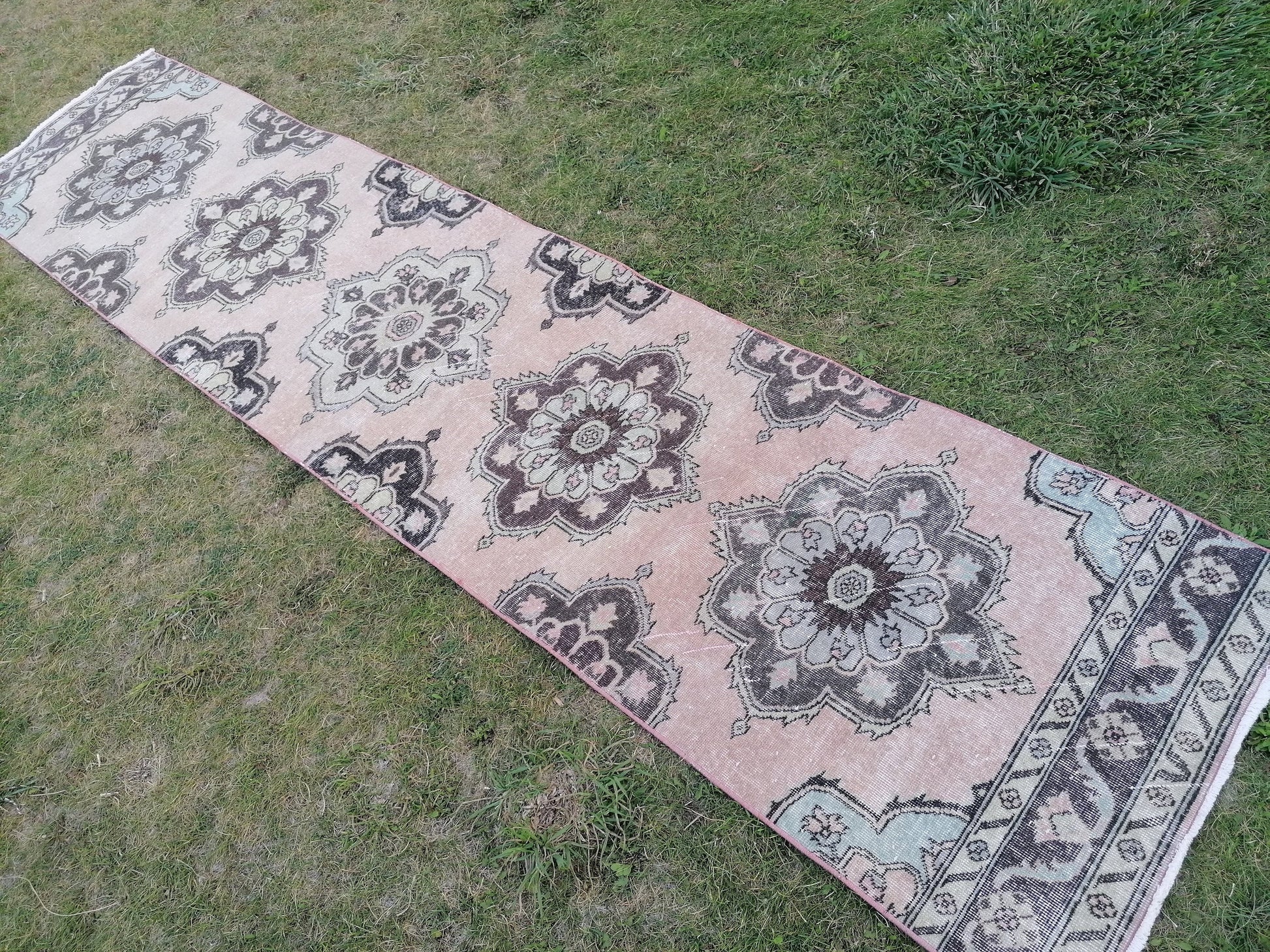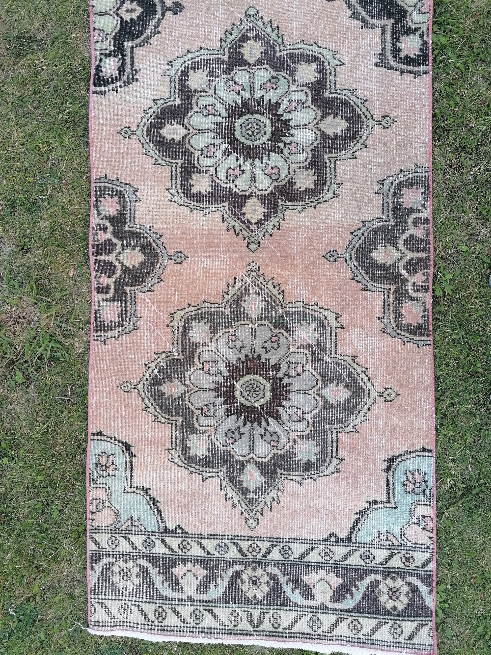 2'8x11'10 oushak turkish runner rug, vintage green runner rug, vintage wool runne, vintage hand made rug , kitchen runner rug,