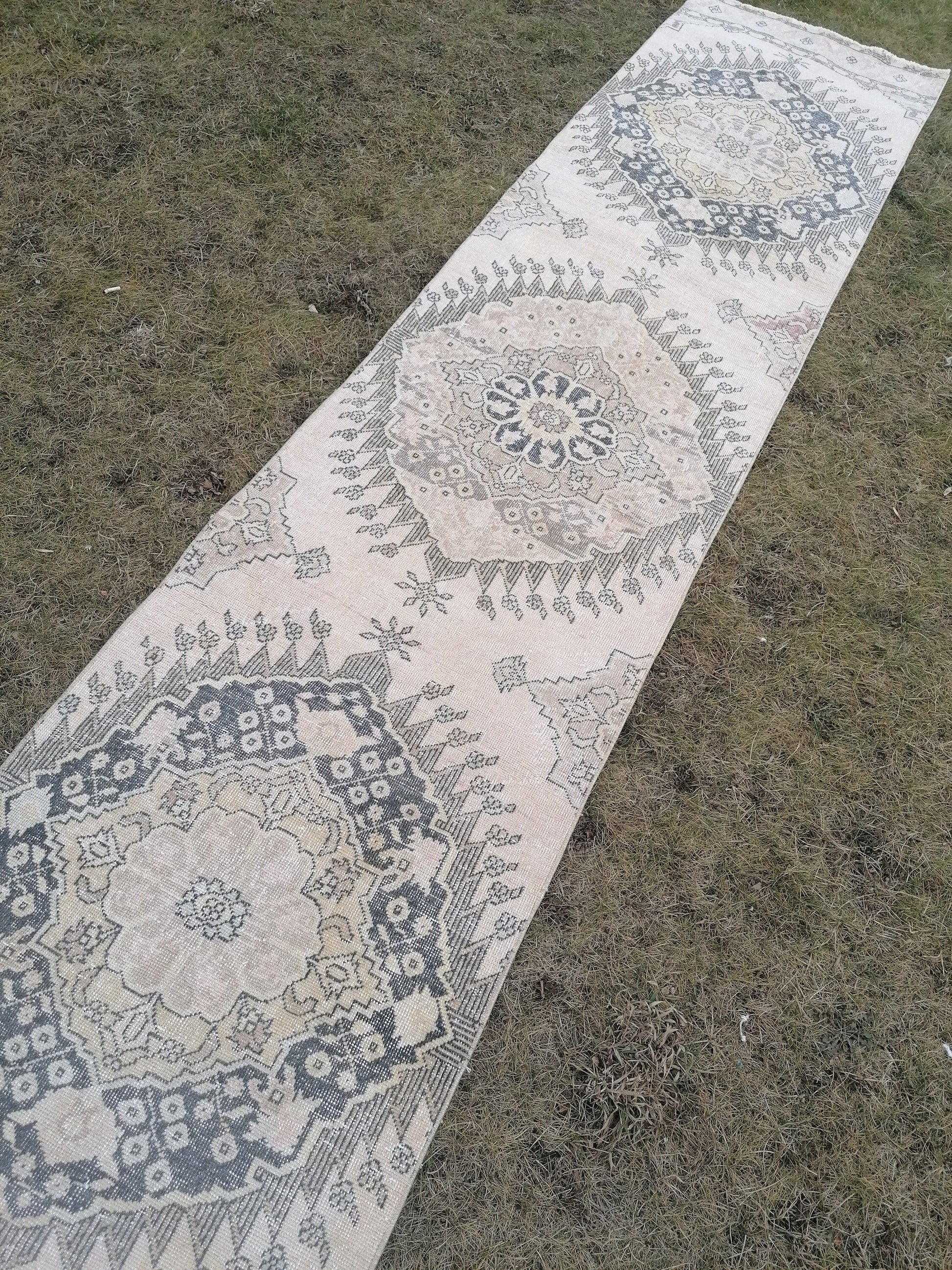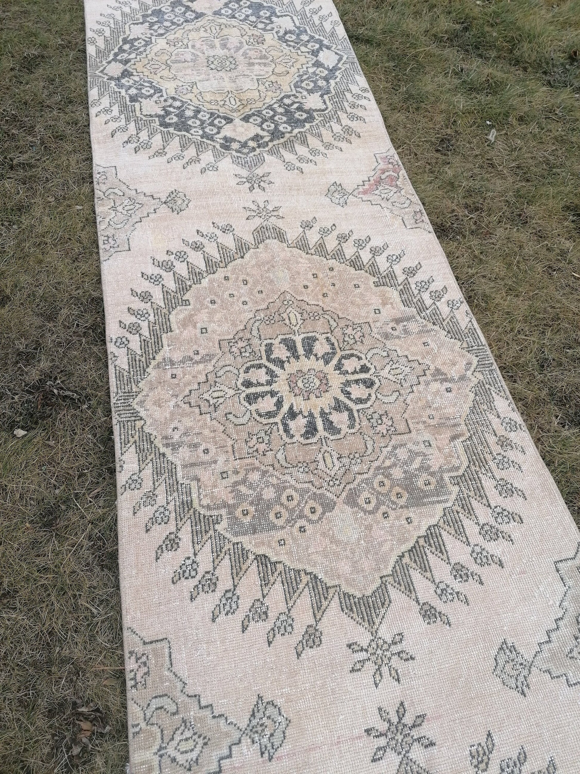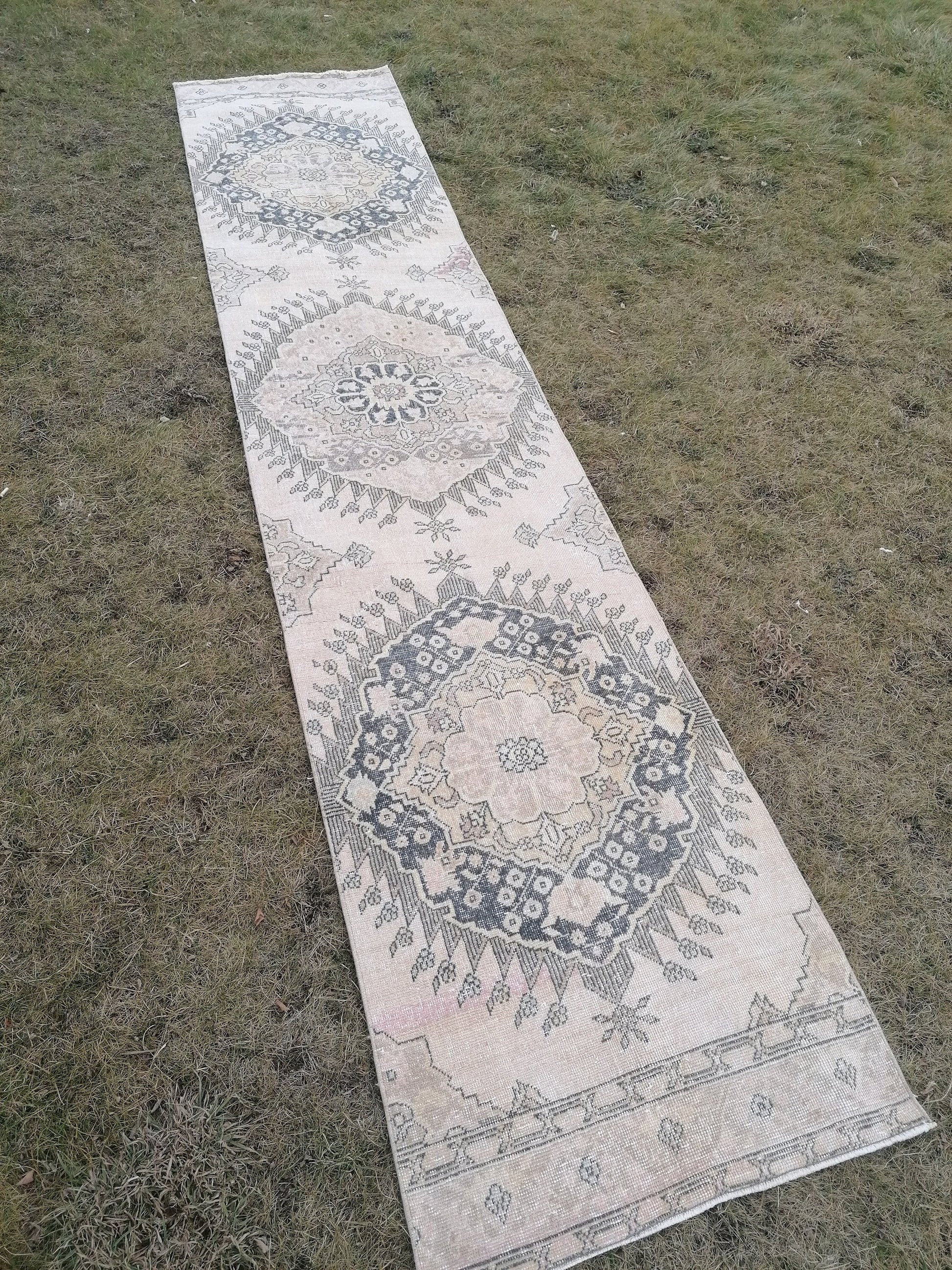 2'9x13 vintage hallway runner rug, neutral oushak runner rug, handmade runner, kitchen runner