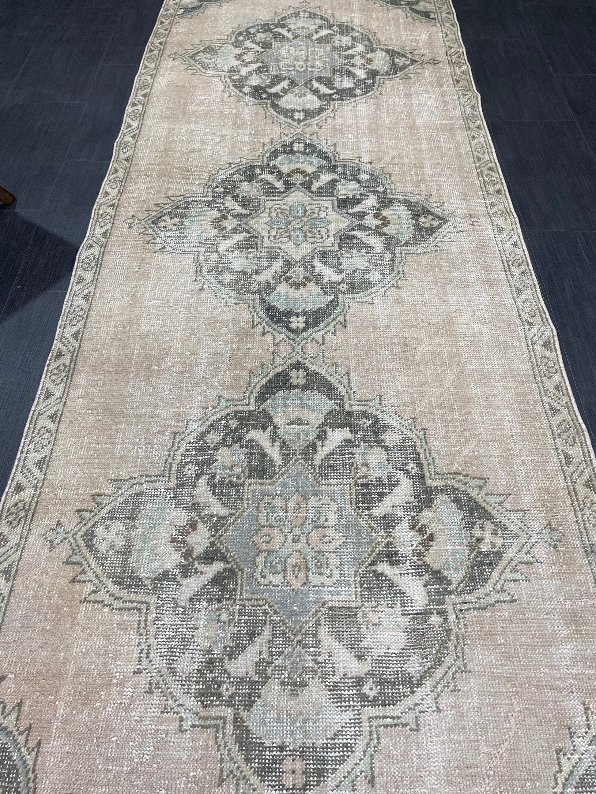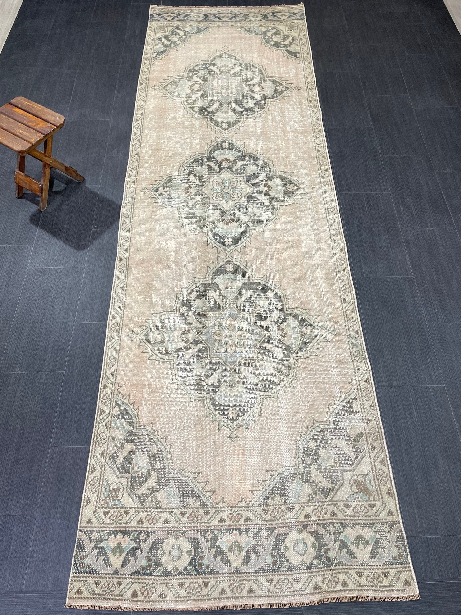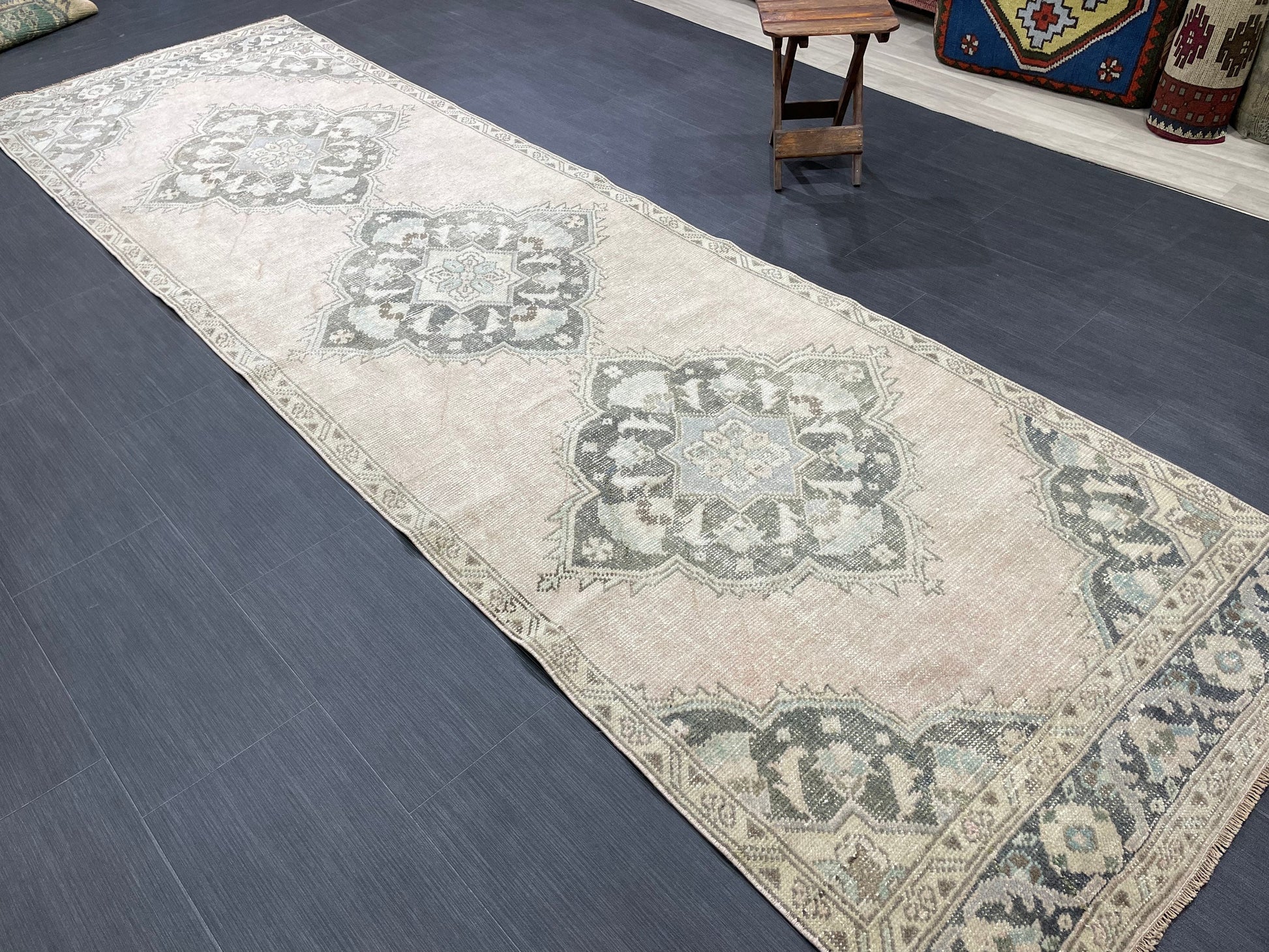 3.4 x 11.2 Faded Oushak Runner Rug Turkish Runner Rug Distressed Vintage Runner Rug Hallway Runner Kitchen Runner Wool Pastel Pink And Green