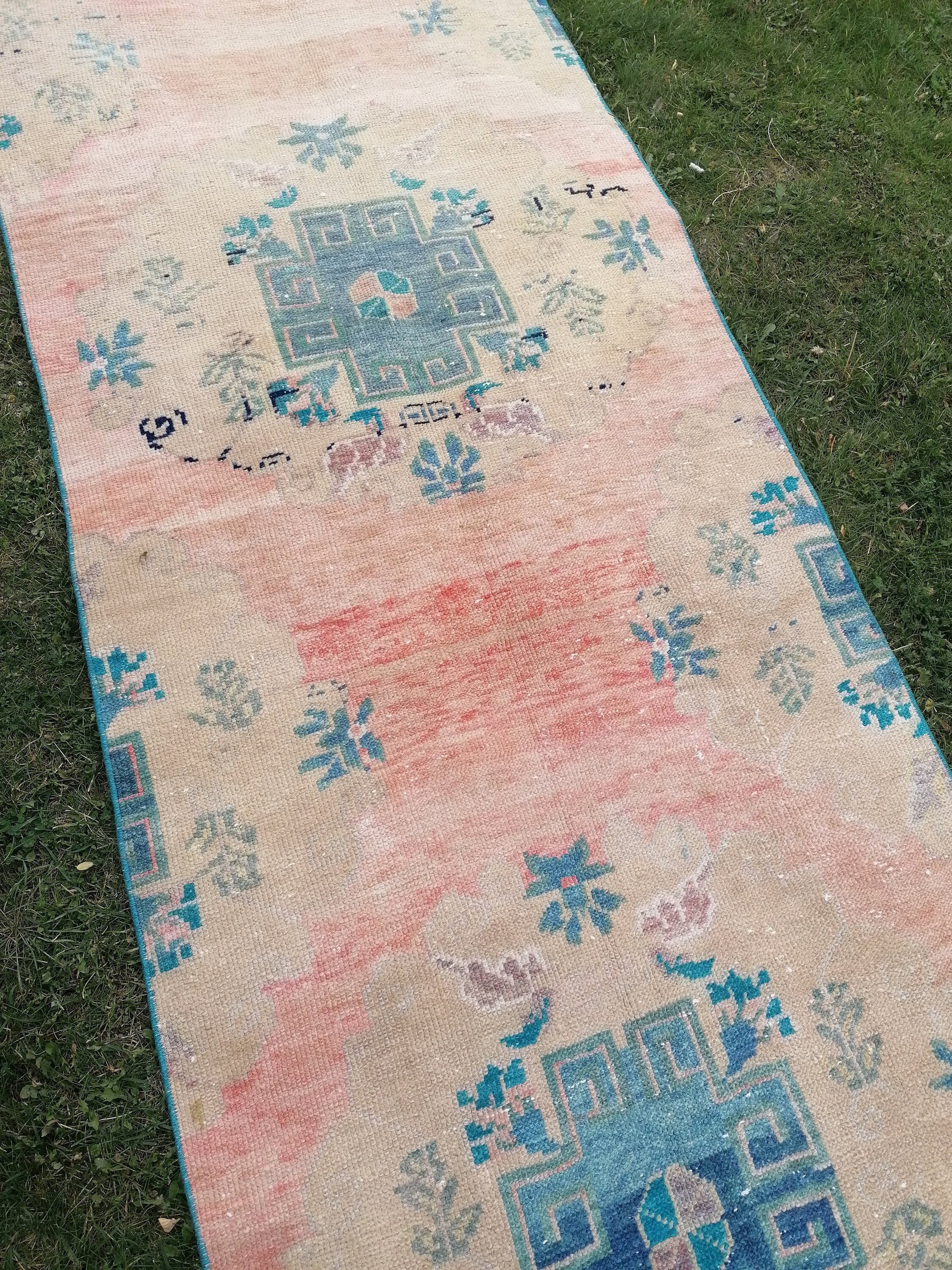 3 x 12 Turkish wool runner rug, blue runner rug, vintage runner rug, kitchen runner rug,hallway runner rug, oushak runner