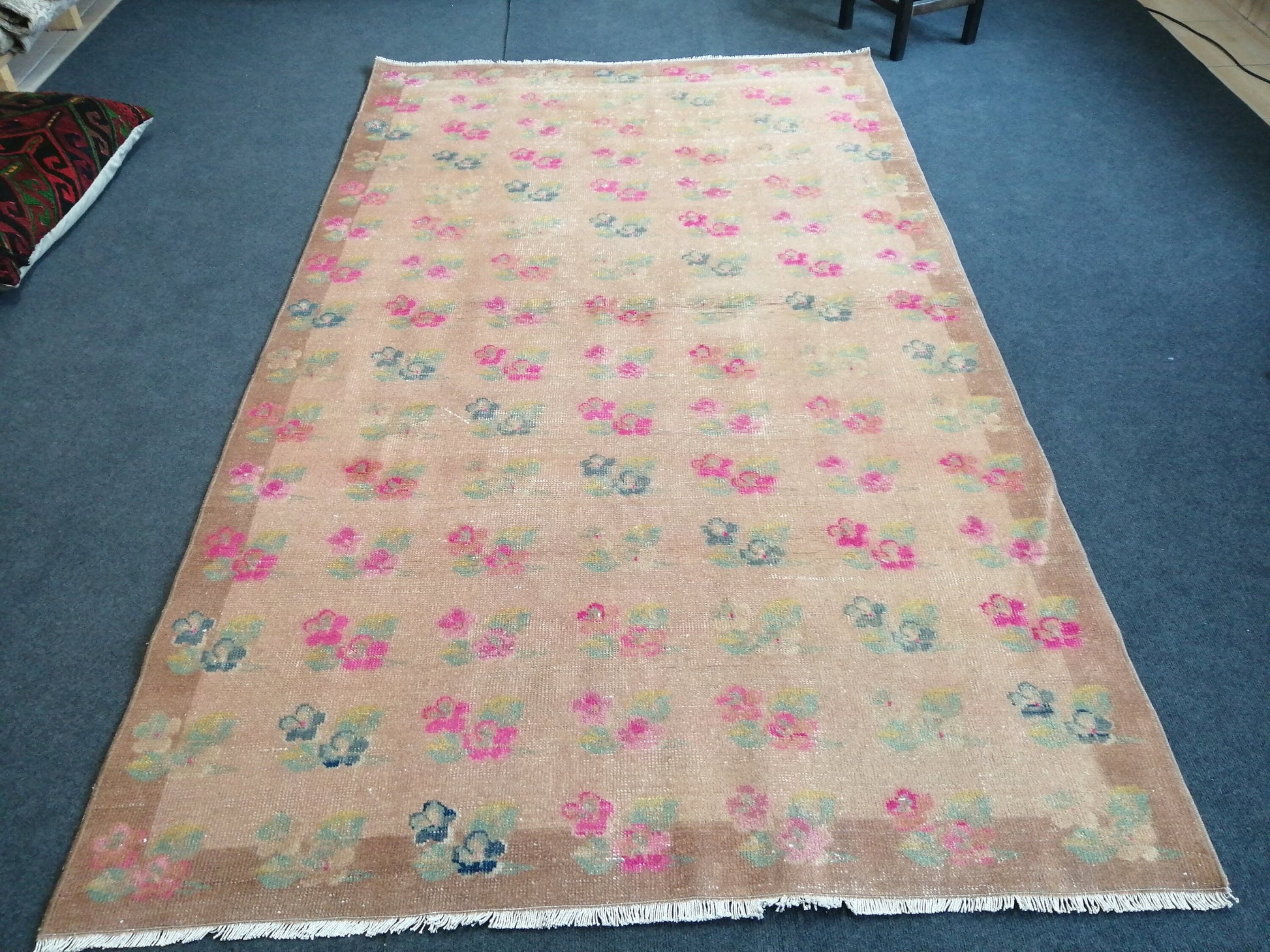 4.8 x 8 Floral OUSHAK RUG TURKISH Muted Rug Vintage Pink Floral Rug Vintage Runner Rug Wool Oushak Rug Hand Made Rugs Vintage Turkish Rug