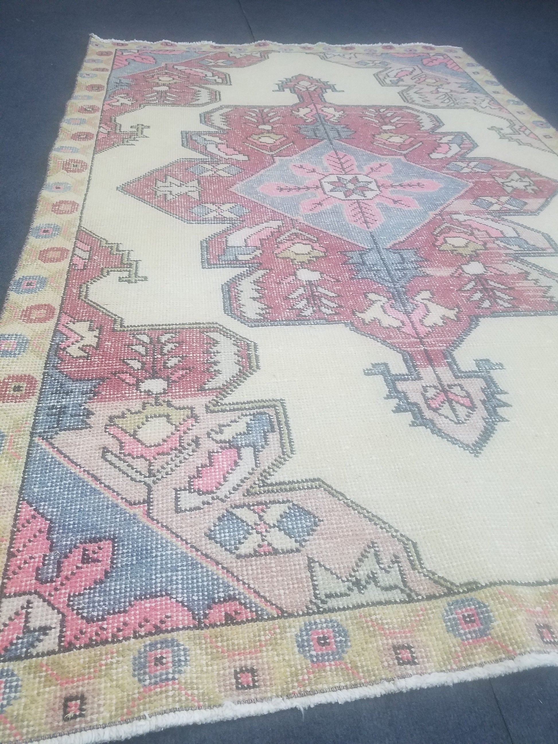 4x7 feet wool vintage rug, oushak bedroom rug, turkish living room rug, kitchen rug, bohemian rug, handmade lounge area rug, bathroom rugs