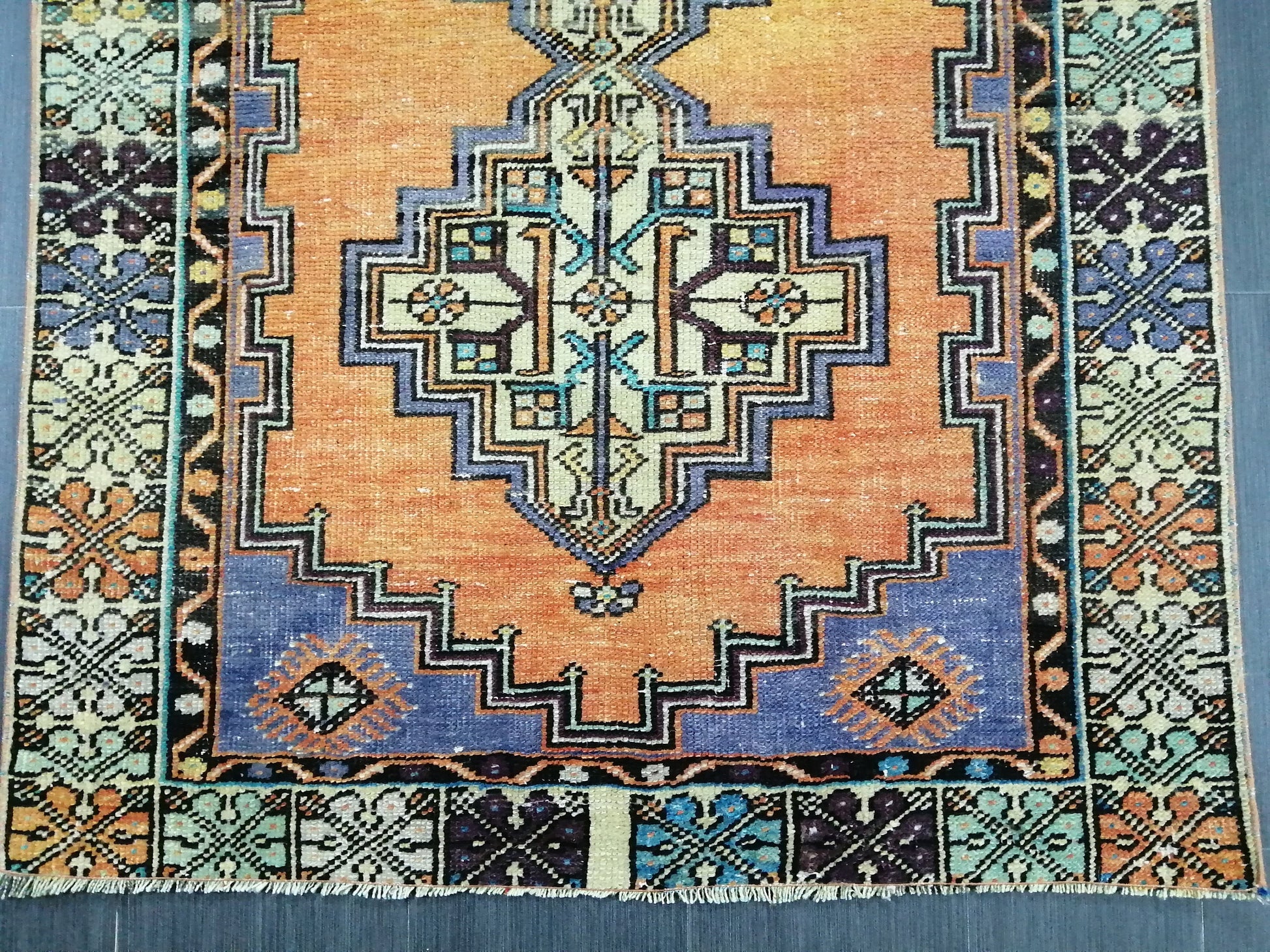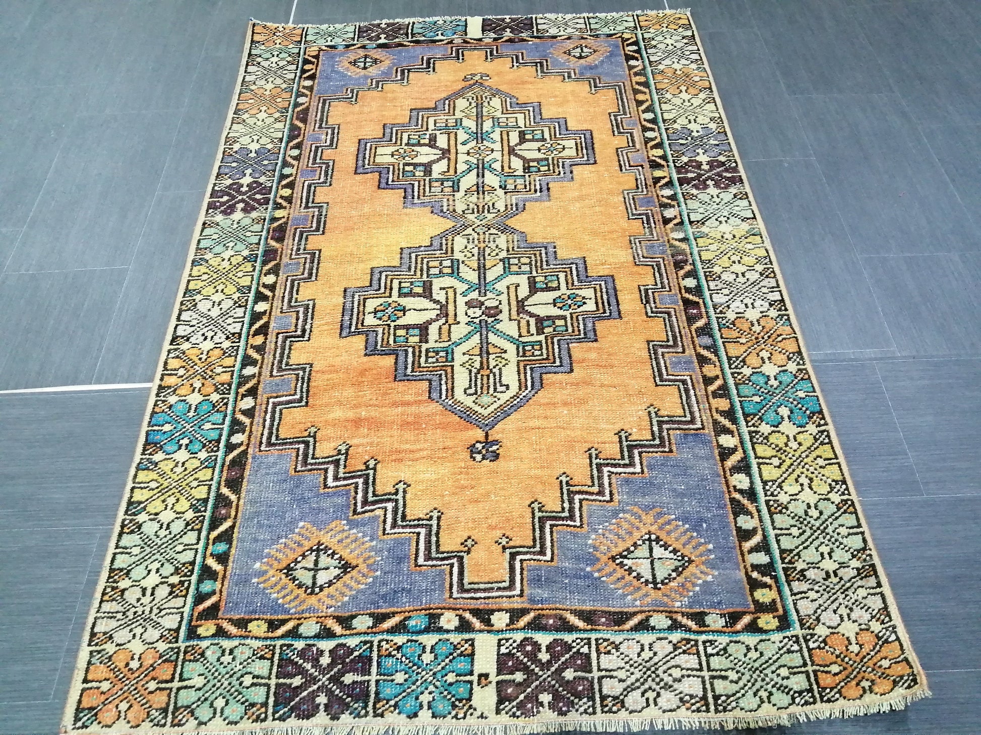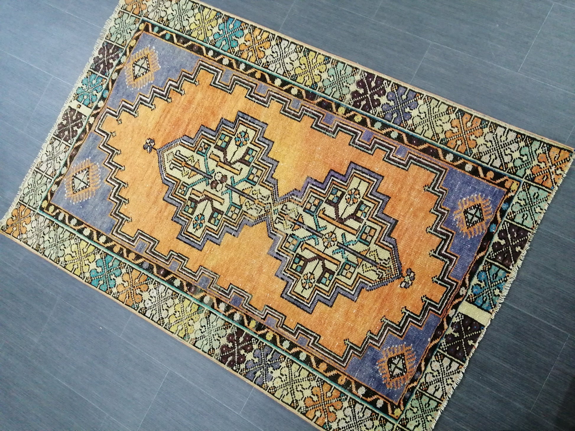 *A vintage handmade Turkish rug made of hand spun wool and double knotted on sturdy foundation,