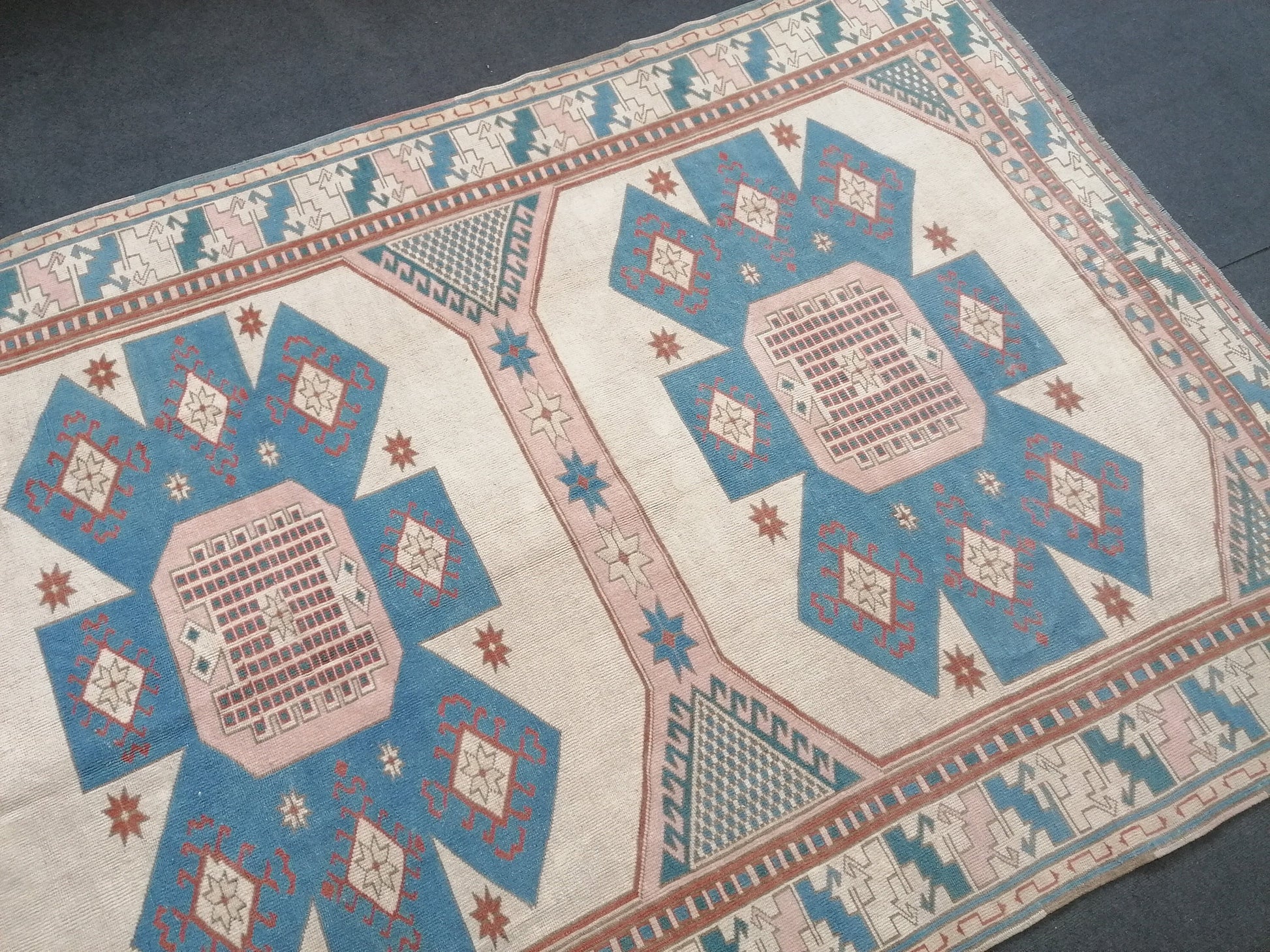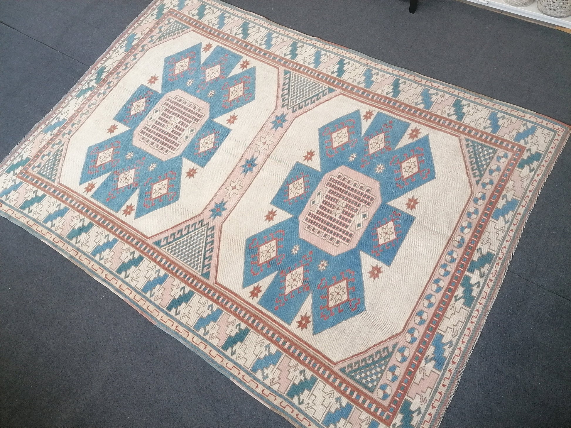 6x8 feet oversize vintage turkish rug, soft oushak handmade rug, pastel blue kitchen area rug, lounge anatolian rug,oversize office area rug