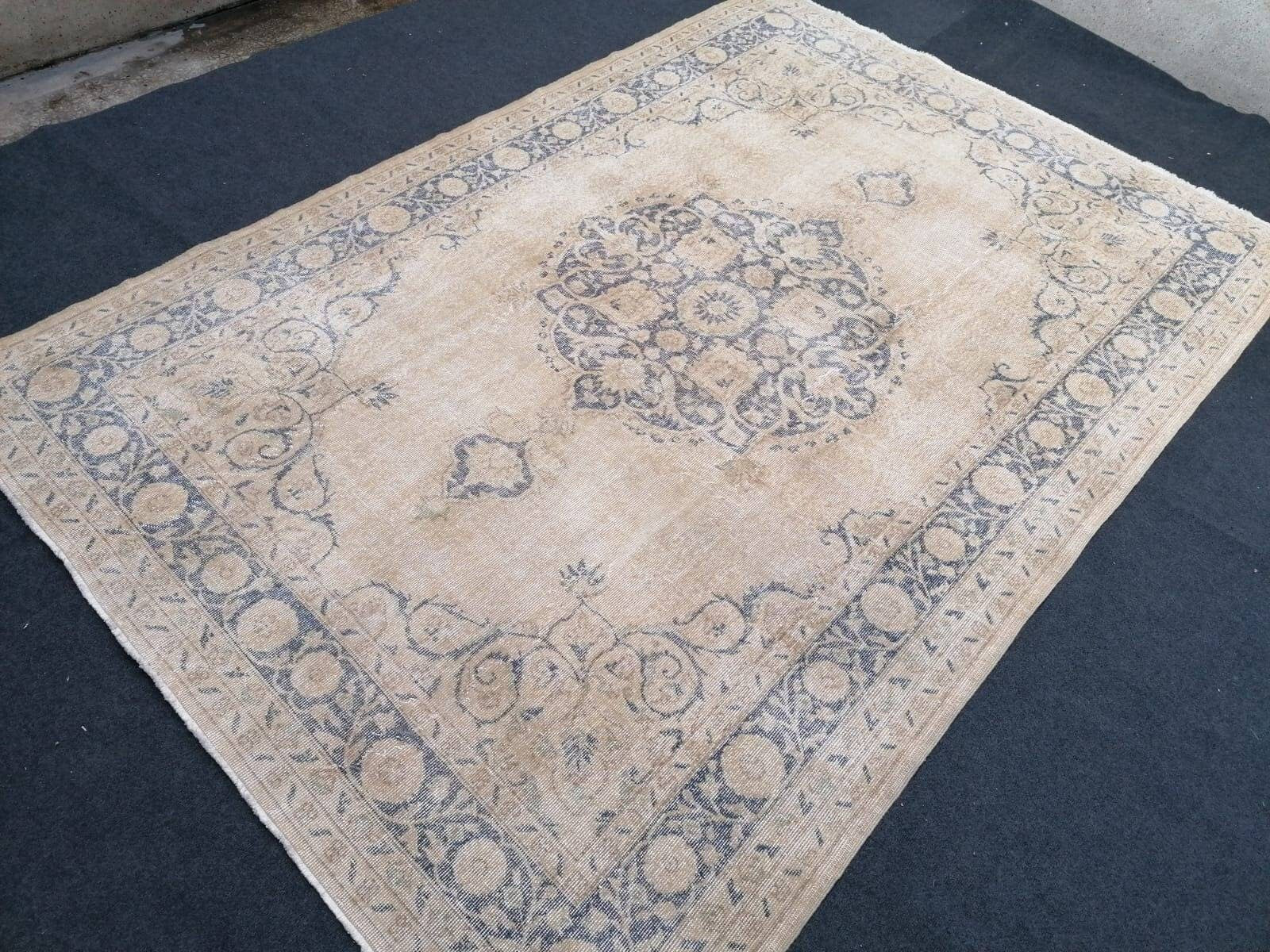 7 x 10.2 large oushak rug, vintage blue rug, muted turkish rug, hand made vintage wool rug,
