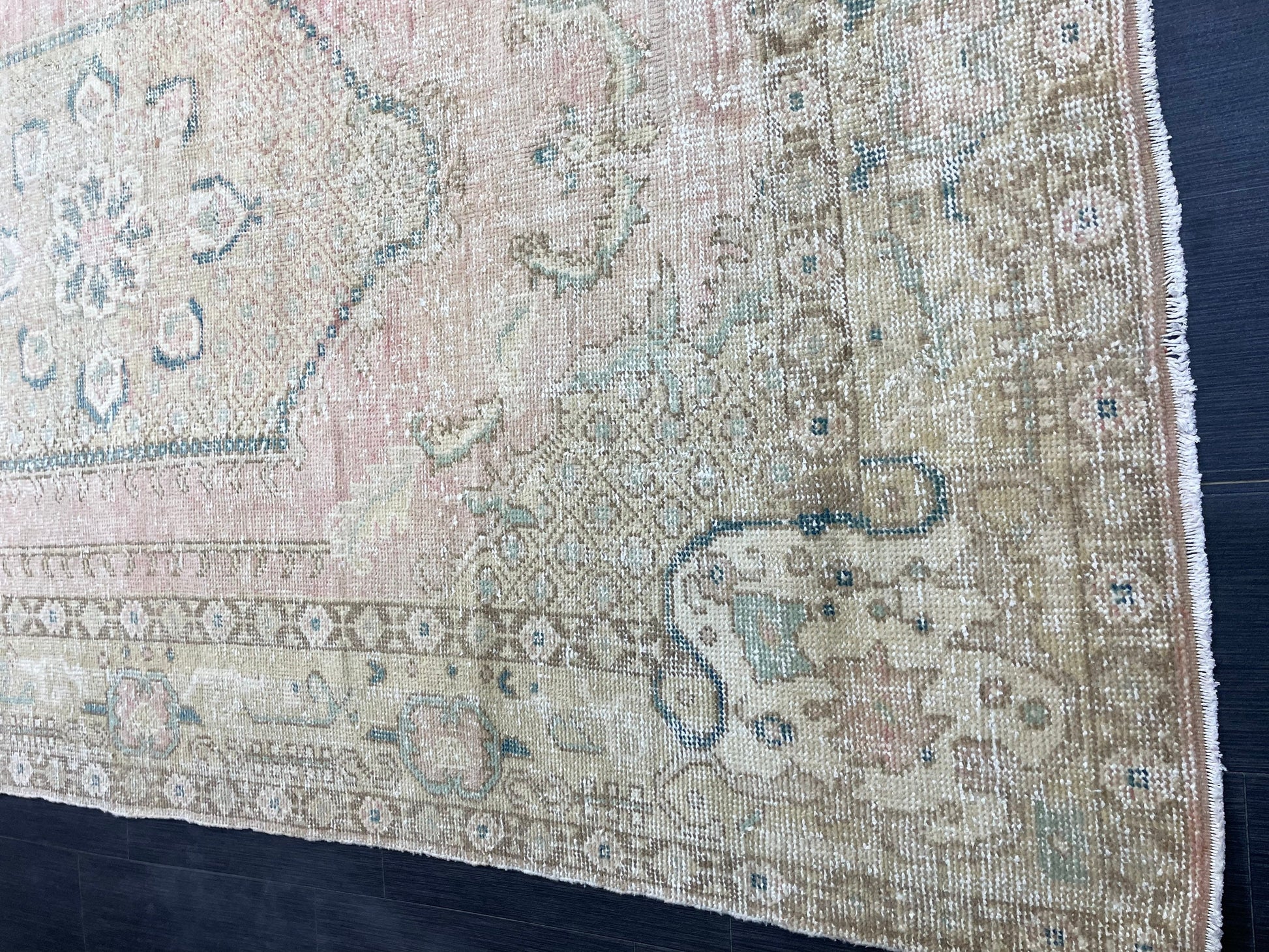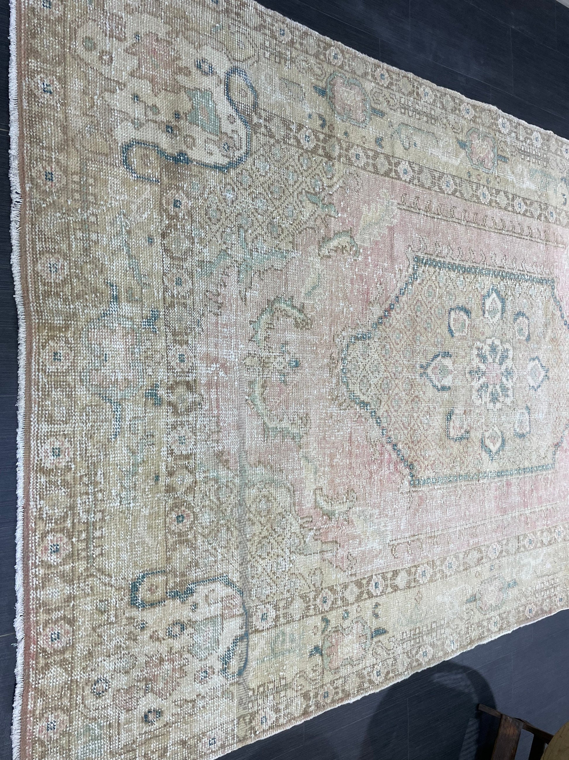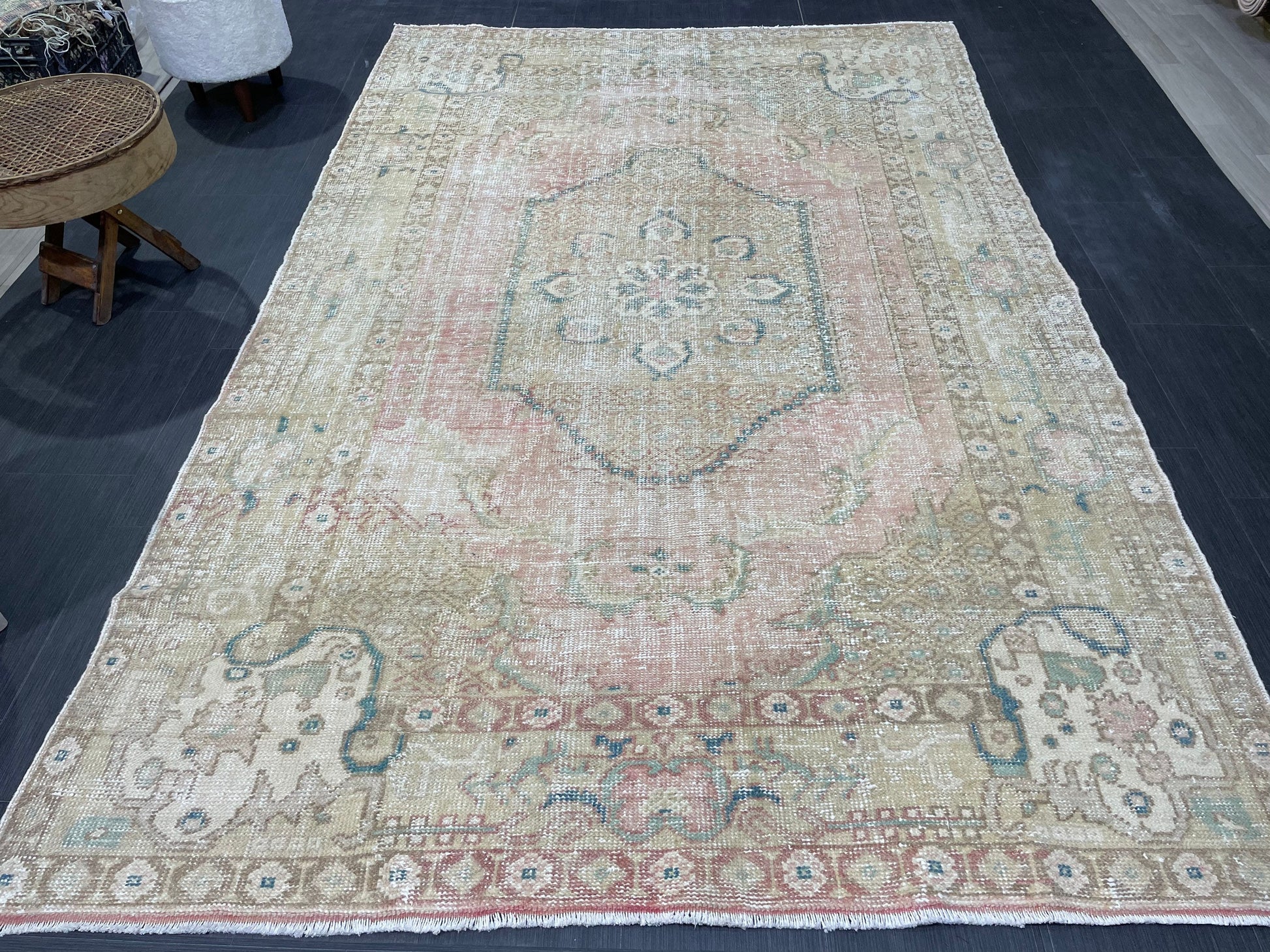 Antique Distressed Rug, TURKISH 6x 9.3 Rug, Hand Knotted Rug, Light Pink Vintage Rug, Wool Oushak Rug Handmade Rug,