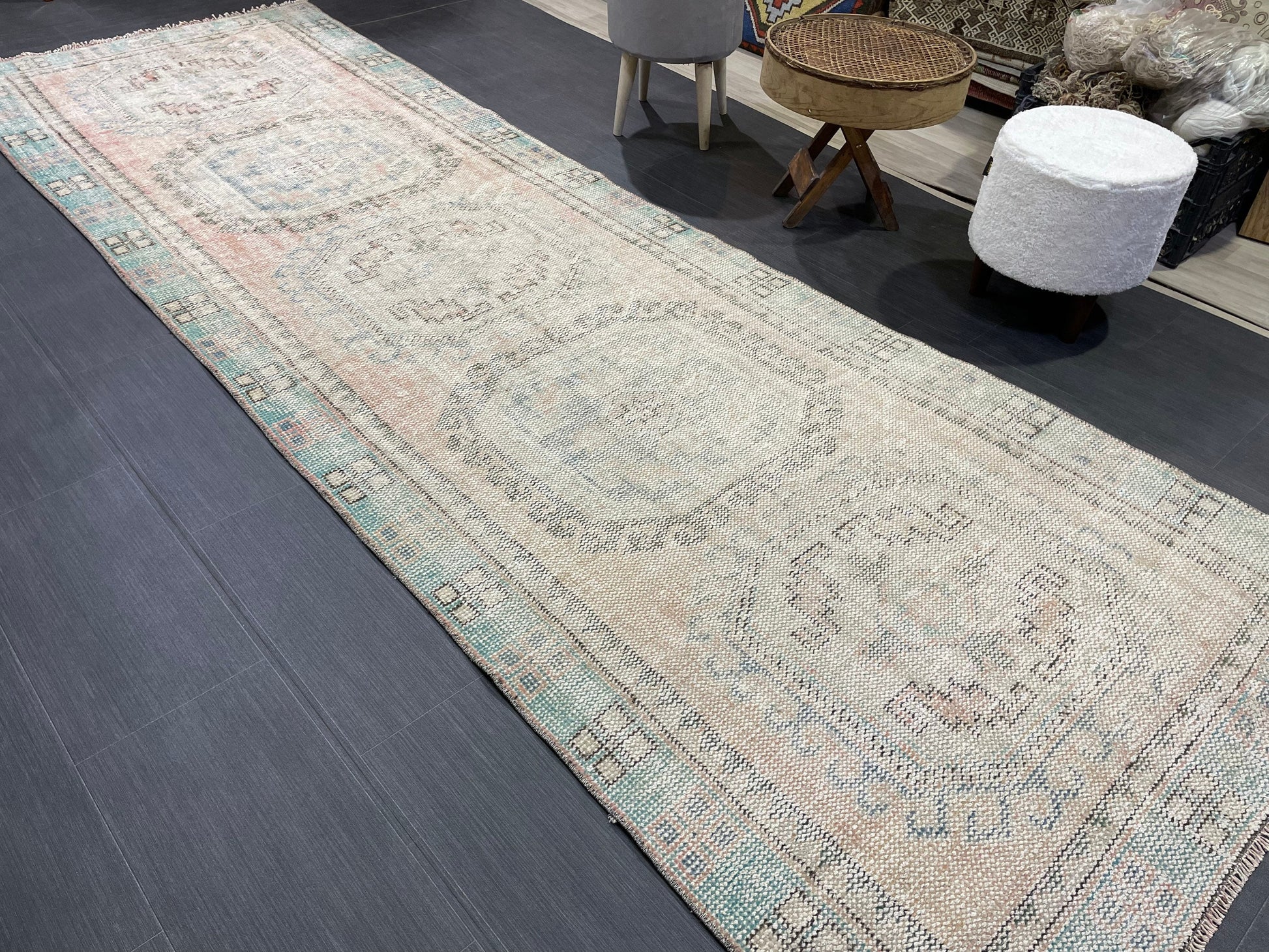 Antique Oushak Runner Rug, Muted Vintage 3.10 x 11.3 Runner Rug, Hallway Runner Rug, Distressed Runner Rug, Wool Runner Rug, Handmade Runner