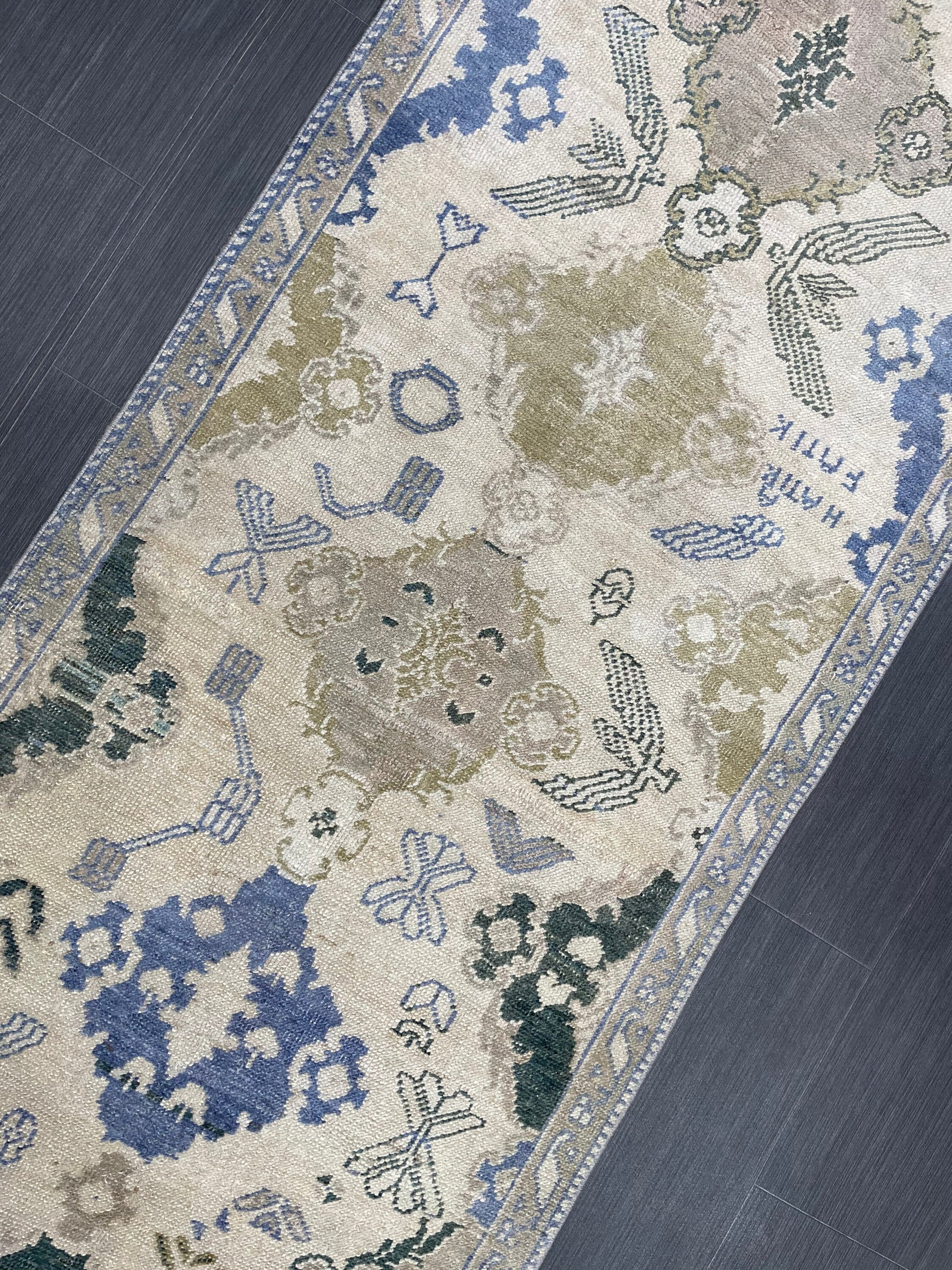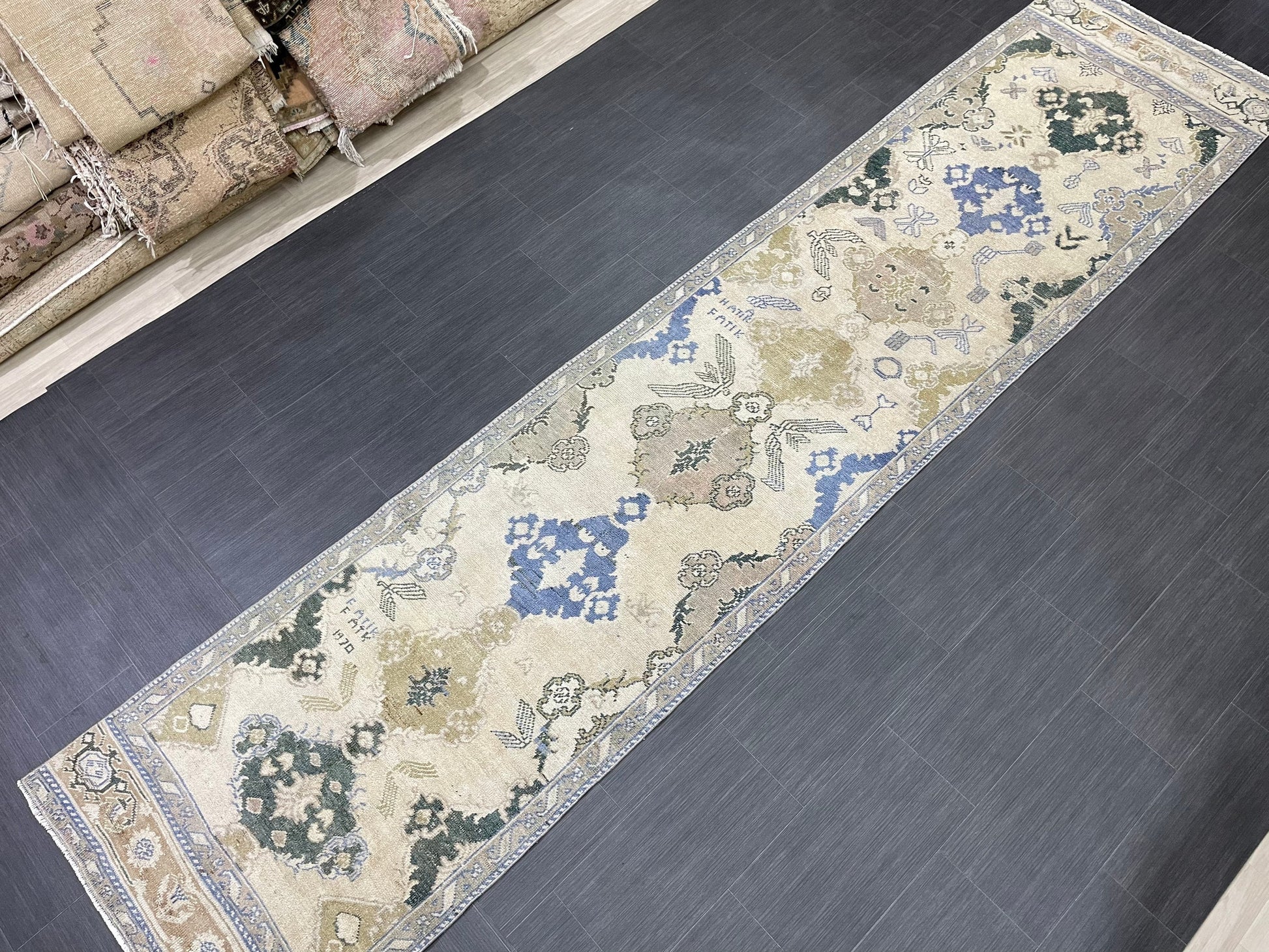 Blue Green Turkish Oushak Runner Rug 3x13 ft Turkish Runner Rug XL Vintage Runner Rug Long Hallway Runner Rug Kitchen Runner Wool Pile