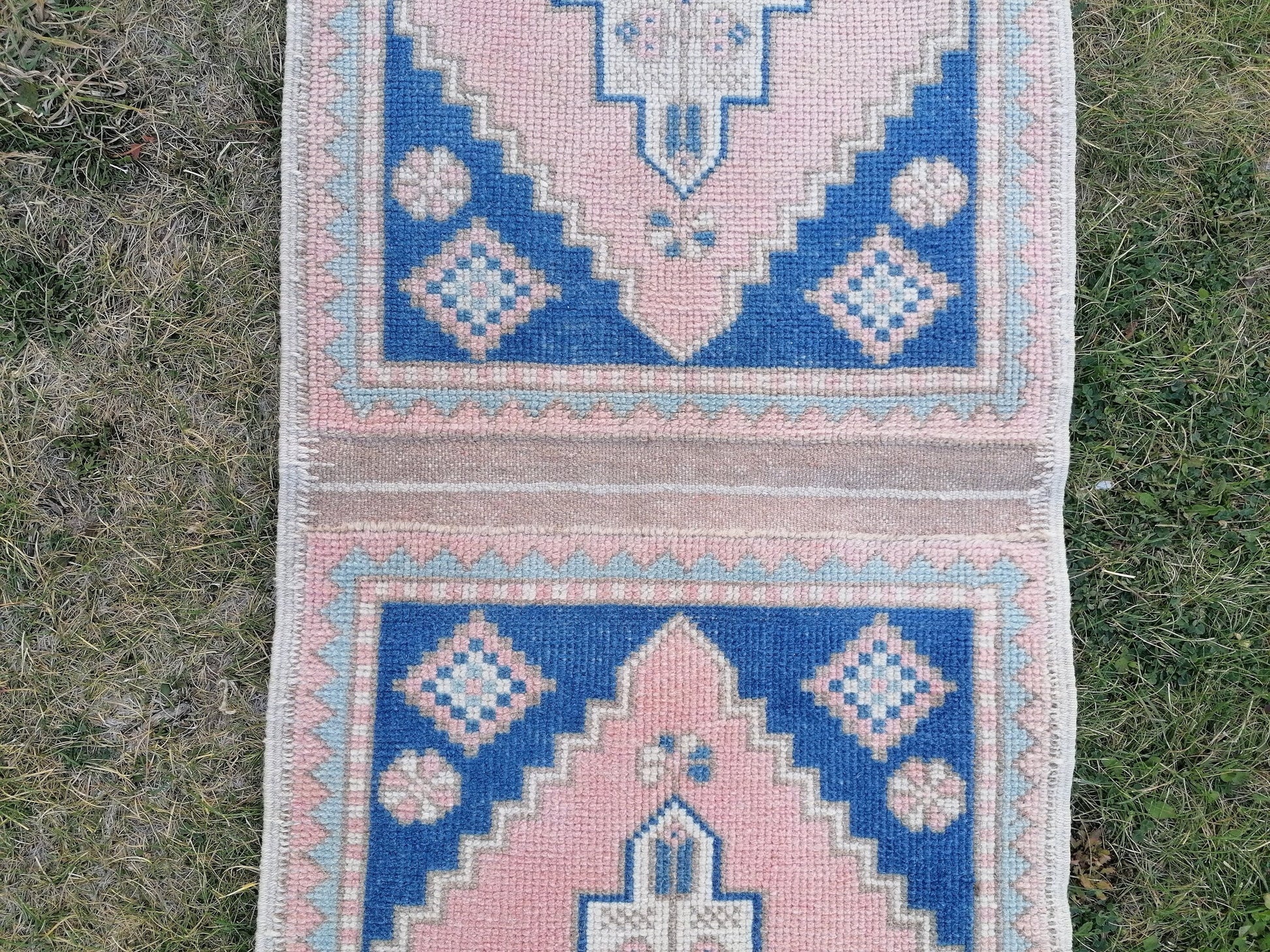 Blue pillow runner rug 1.10 x 7 hallway vintage rug, entryway hand made rug, kitchen runner