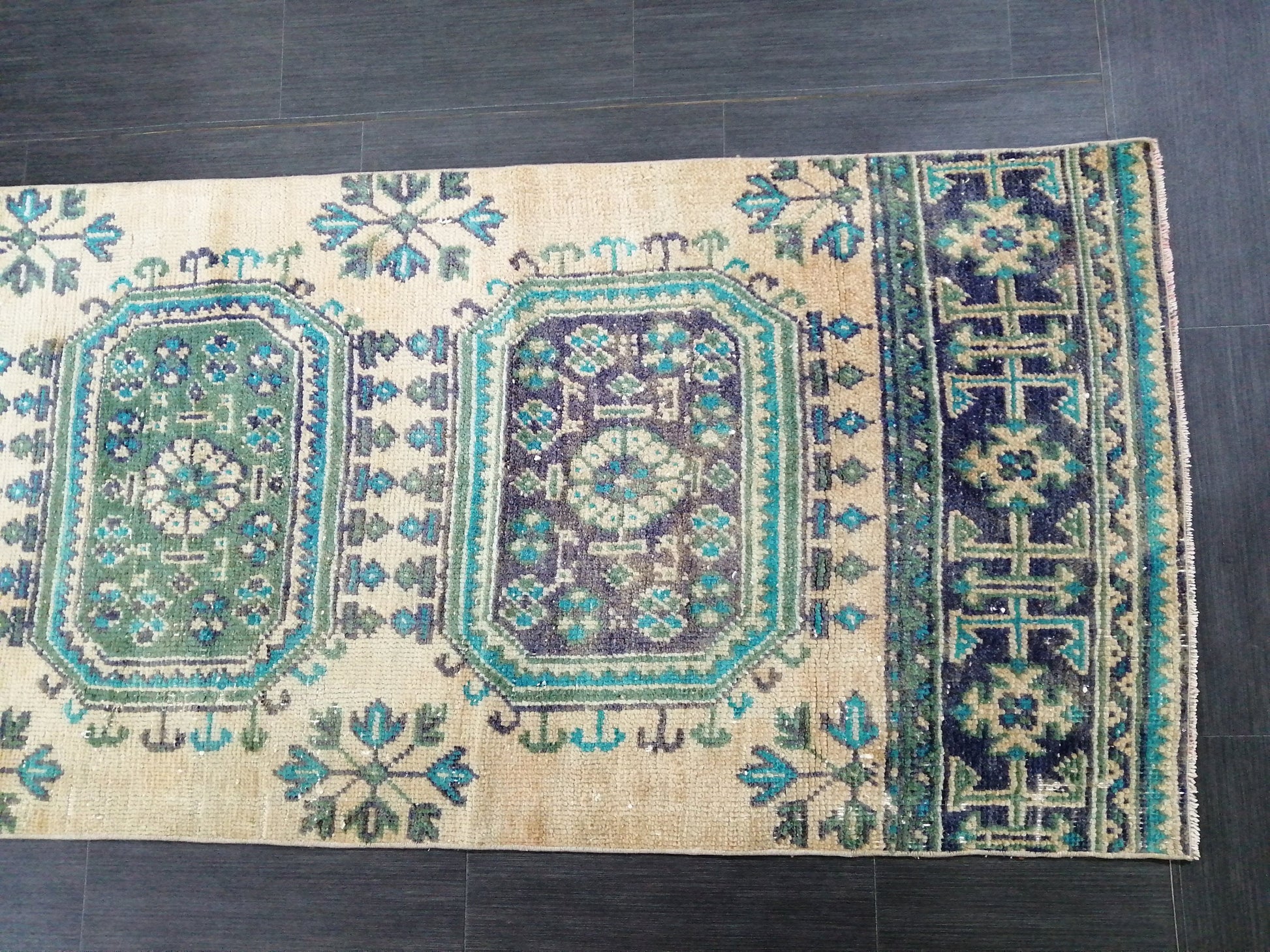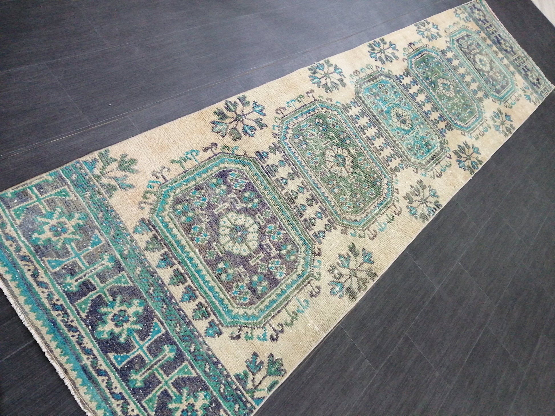 Green Blue Beige Oushak Runner Rug 11.8 x 2.8 Turkish Runner Rug Vintage Runner Rug 3x12 Hallway Runner Rug Kitchen Runner Rug Wool Runner