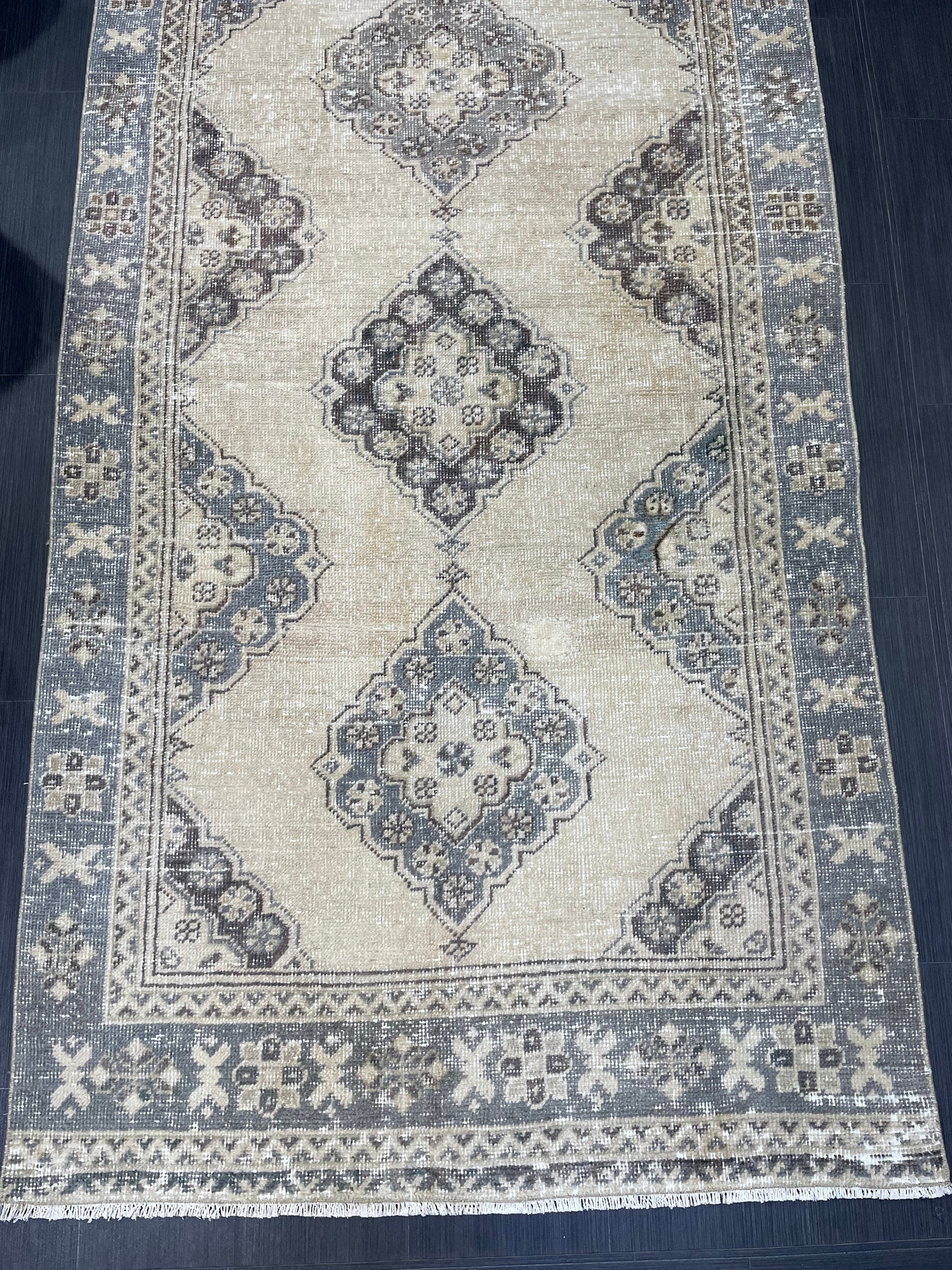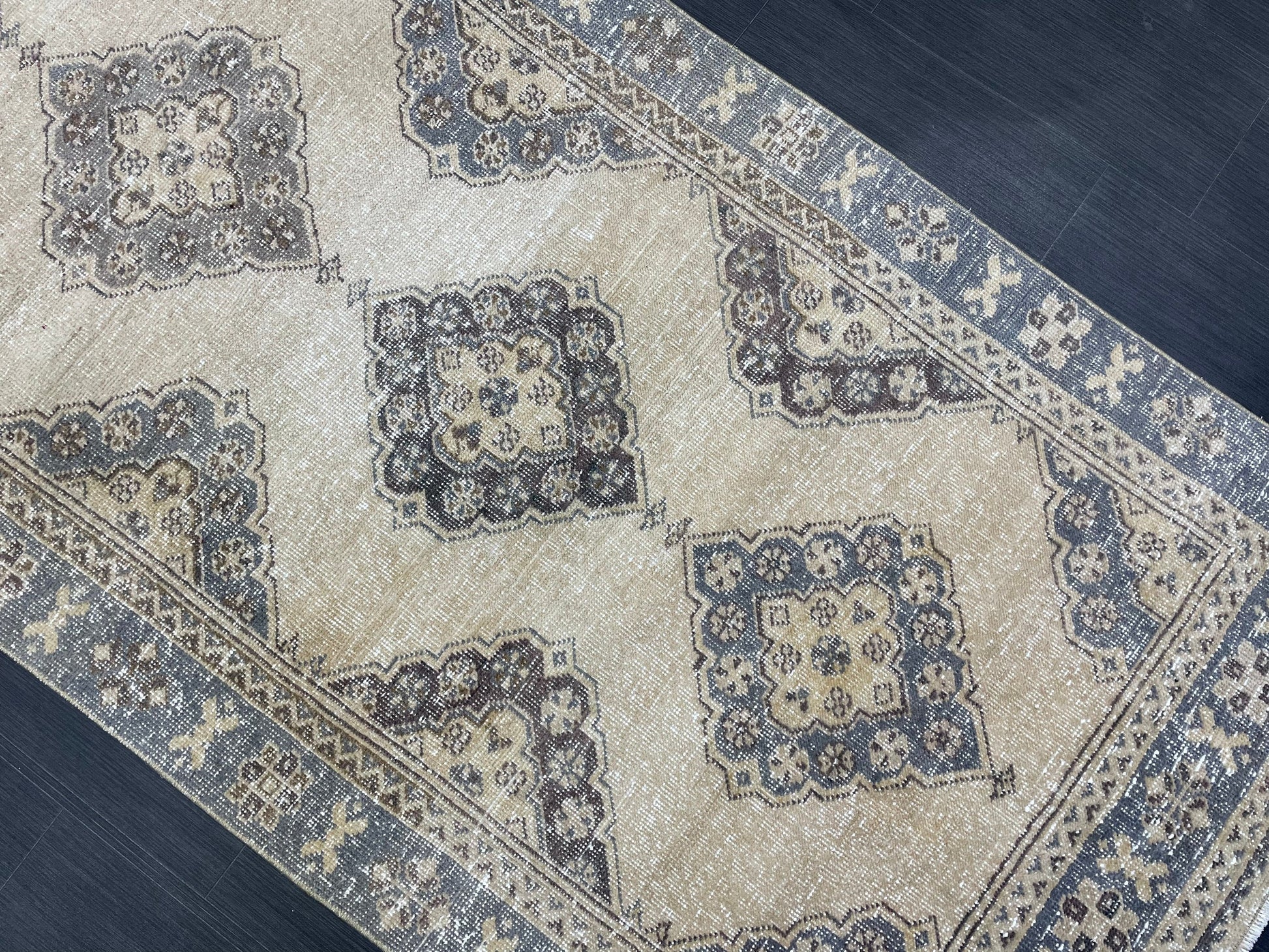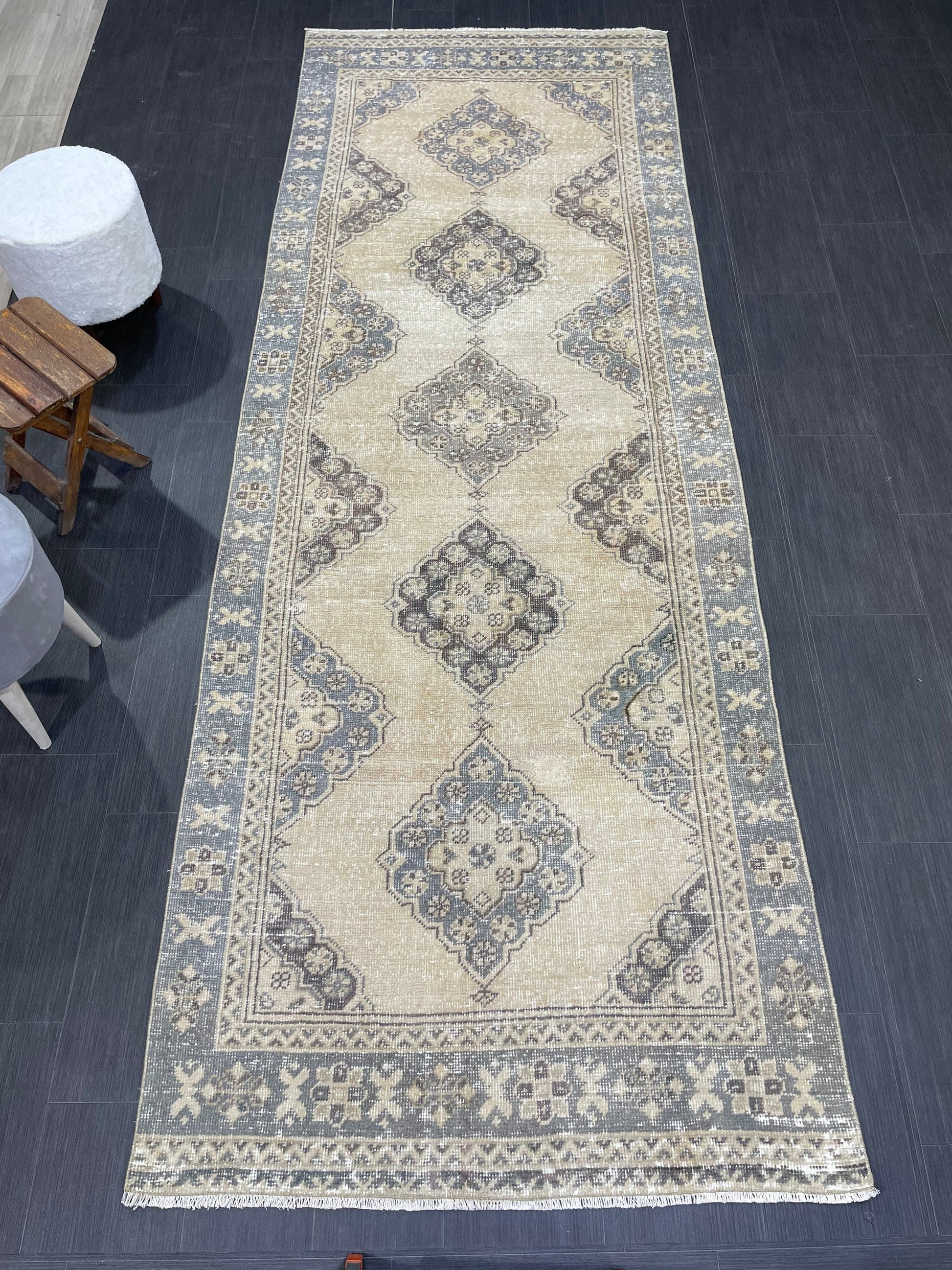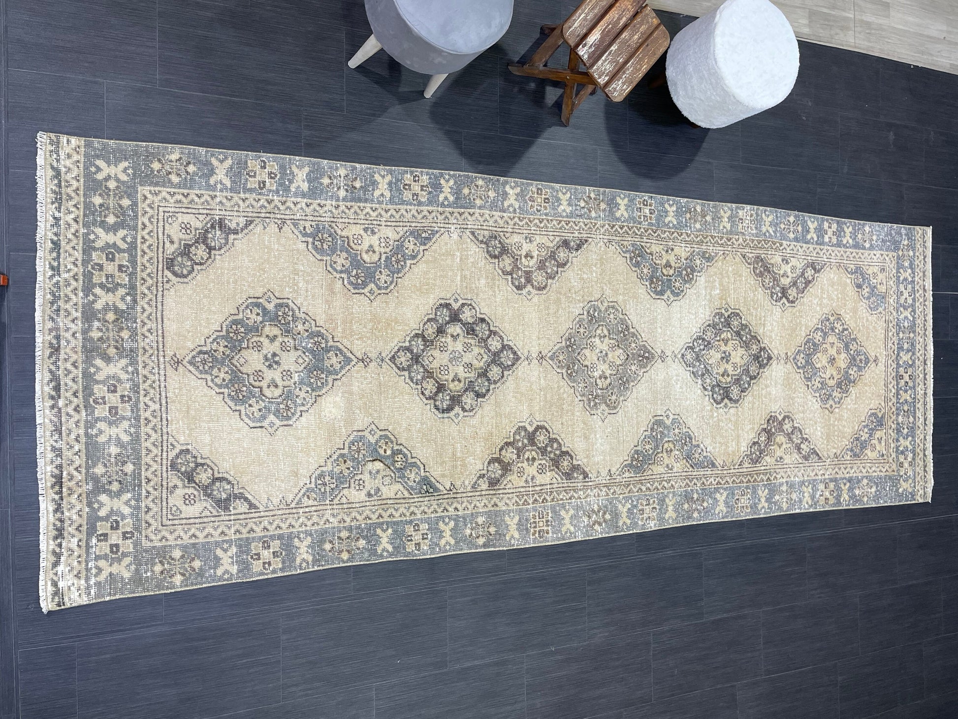 Hand Knotted Runner Rug Turkish Runner 3.8 x 10.8 Rug Vintage Gray Blue Runner Rug Hallway Runner Kitchen Runner Country modern Runner Rug