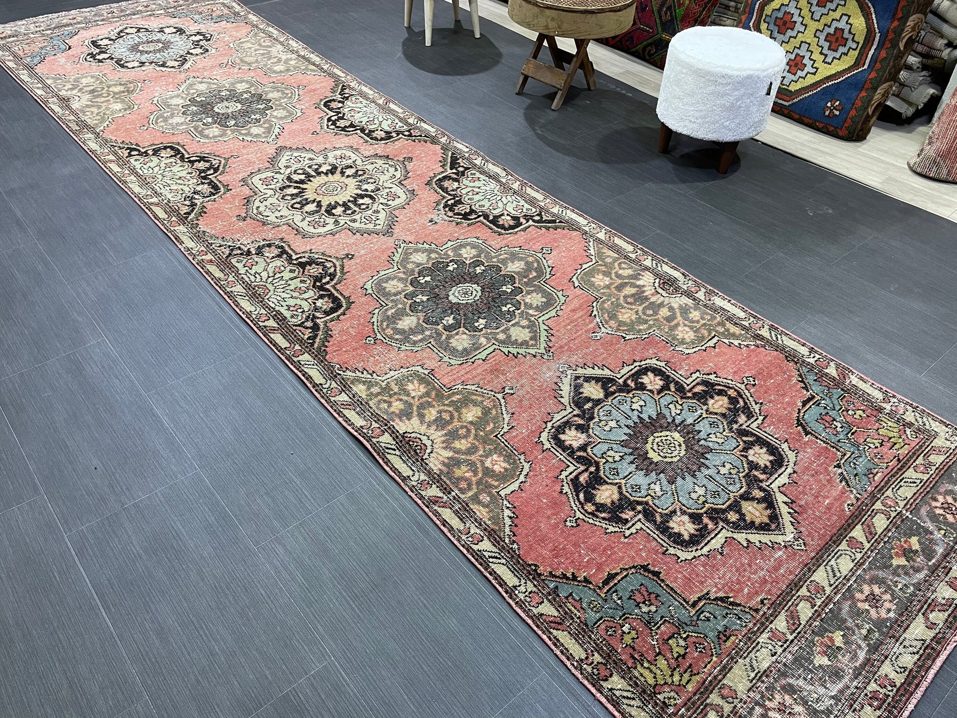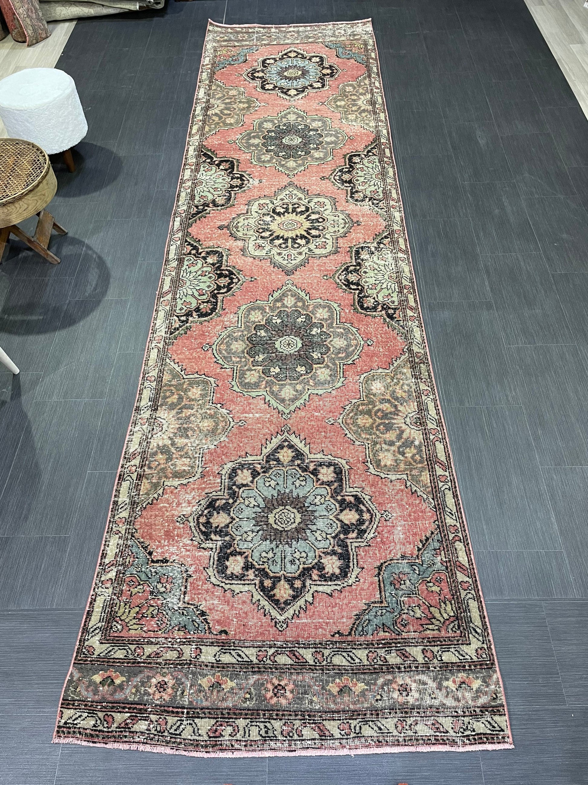Hand Knotted Runner Rug, Vintage 3.4 x 12.7 Runner Rug, Oushak Runner Rug, Turkish Runner Rug Kitchen Runner Rug Wool Runner