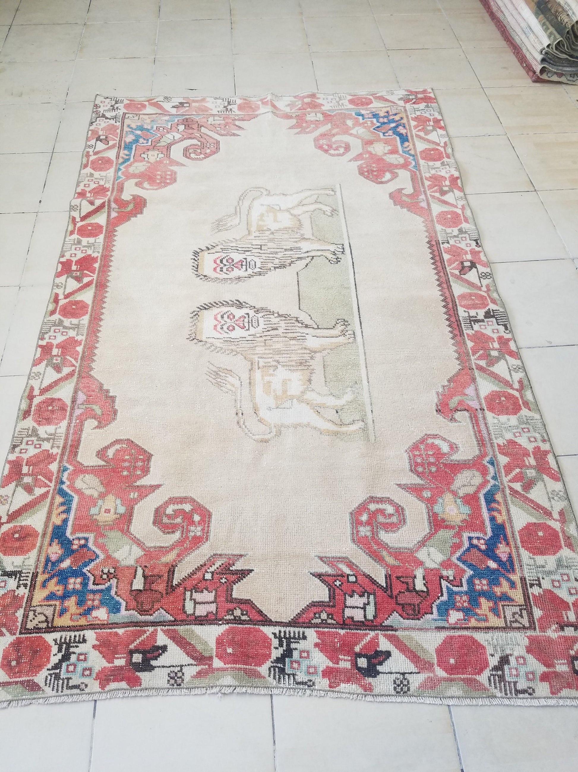 Lion oushak handmade wool rug 4'4x6'12 turkish rug vintage rug, vintage oushak rug, kitchen rug bohemian rug