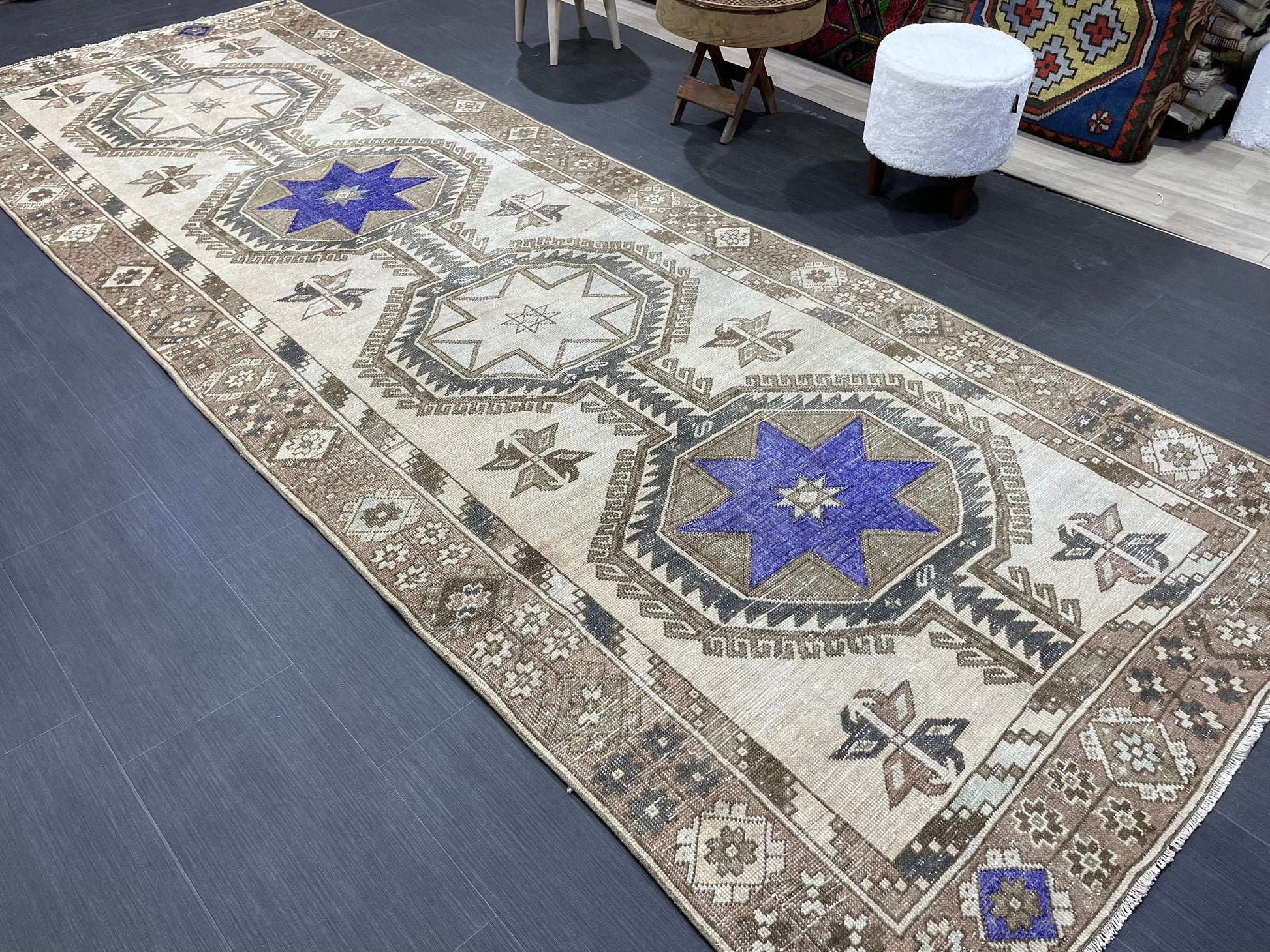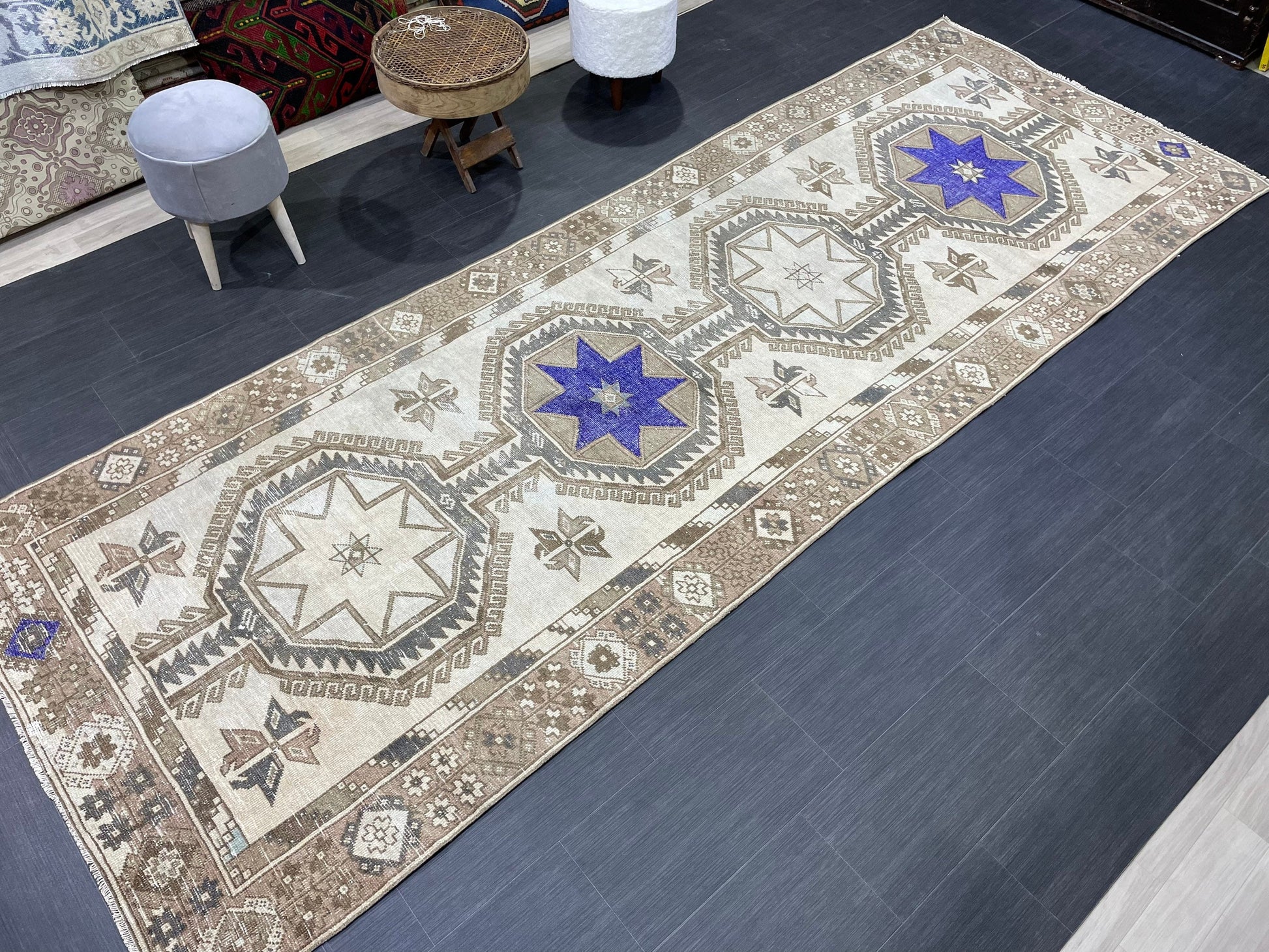 Muted Hand Knotted Runner 4.4 x 12 Rug, Vintage Runner Rug, Hallway Runner Rug, Antique Runner Rug Wool Runner Rug Handmade Runner Rug