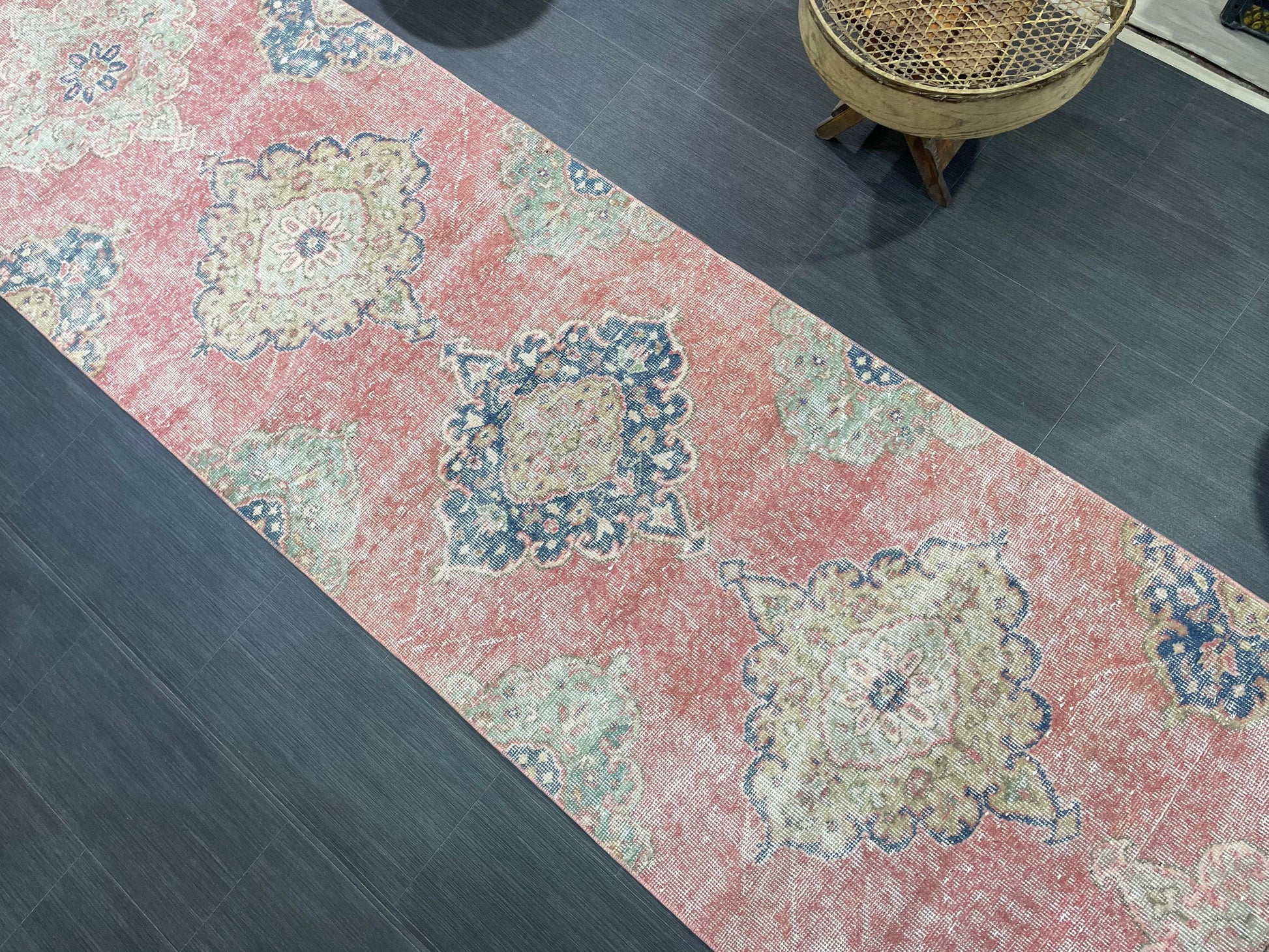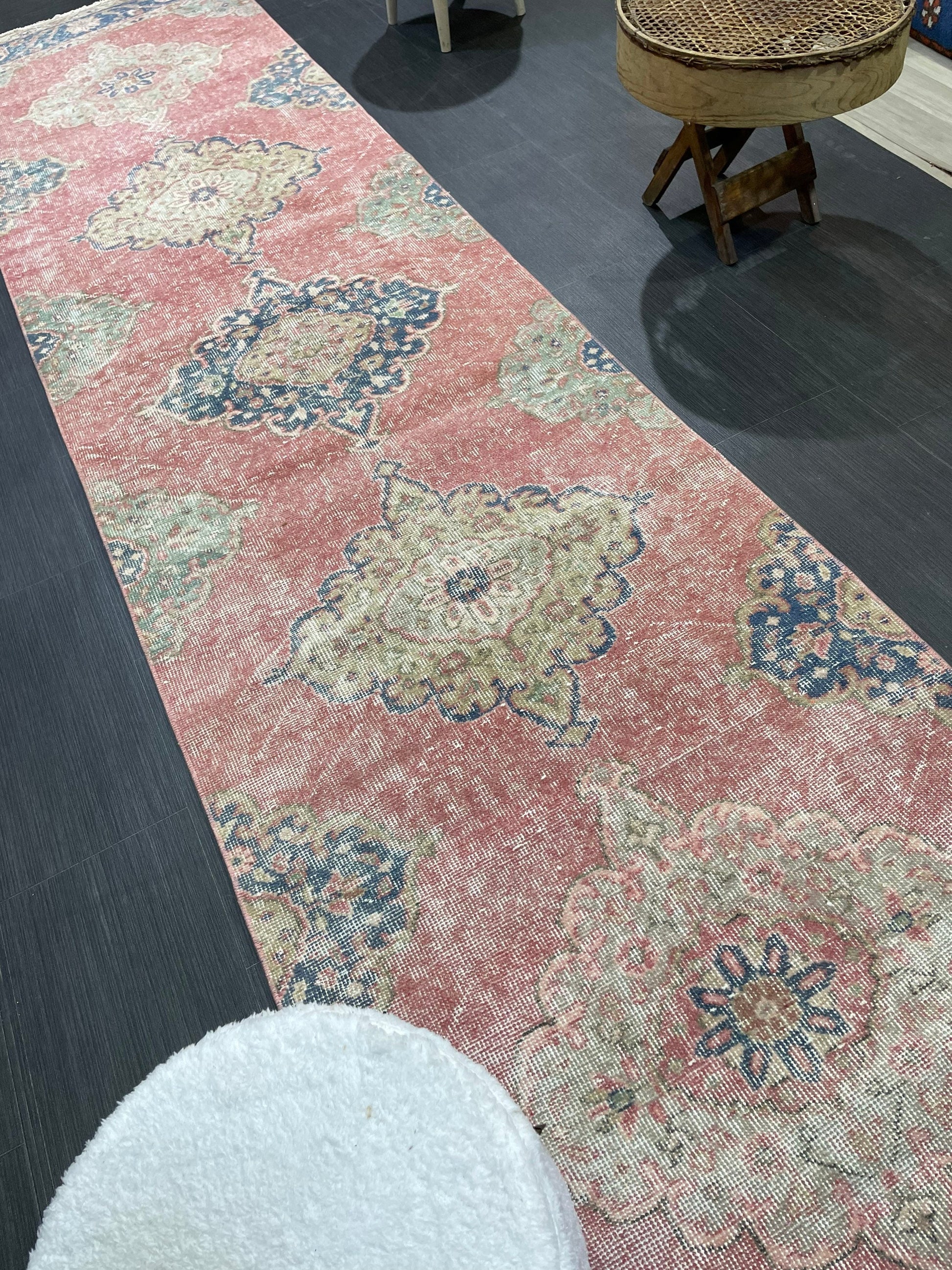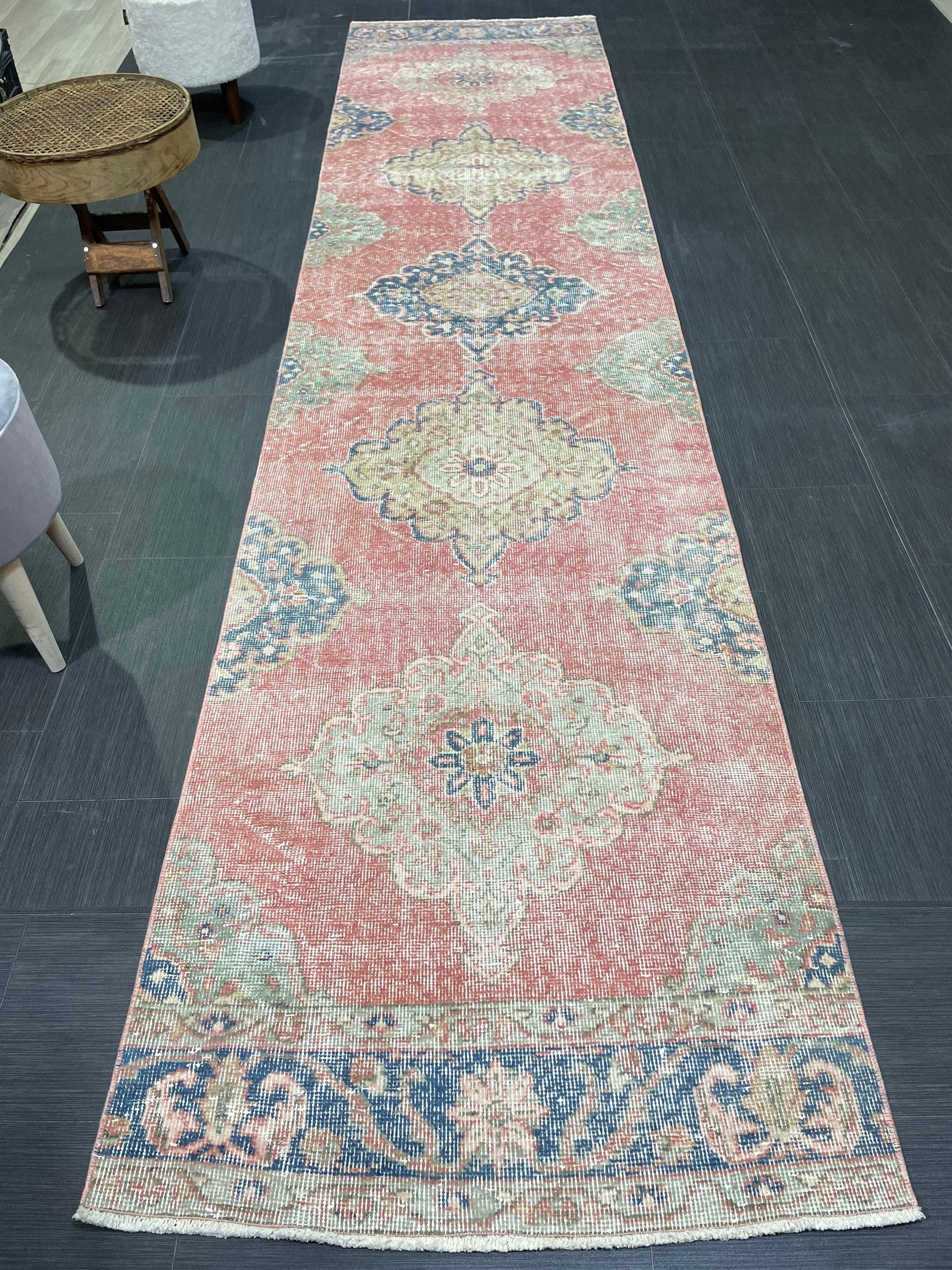 Muted Hand Knotted Runner Rug, Handmade Runner 2.11 x 12.5 Rug, WOOL Oushak Runner Rug, Rustic Rug Runner, Turkish Runner, Vintage Runner