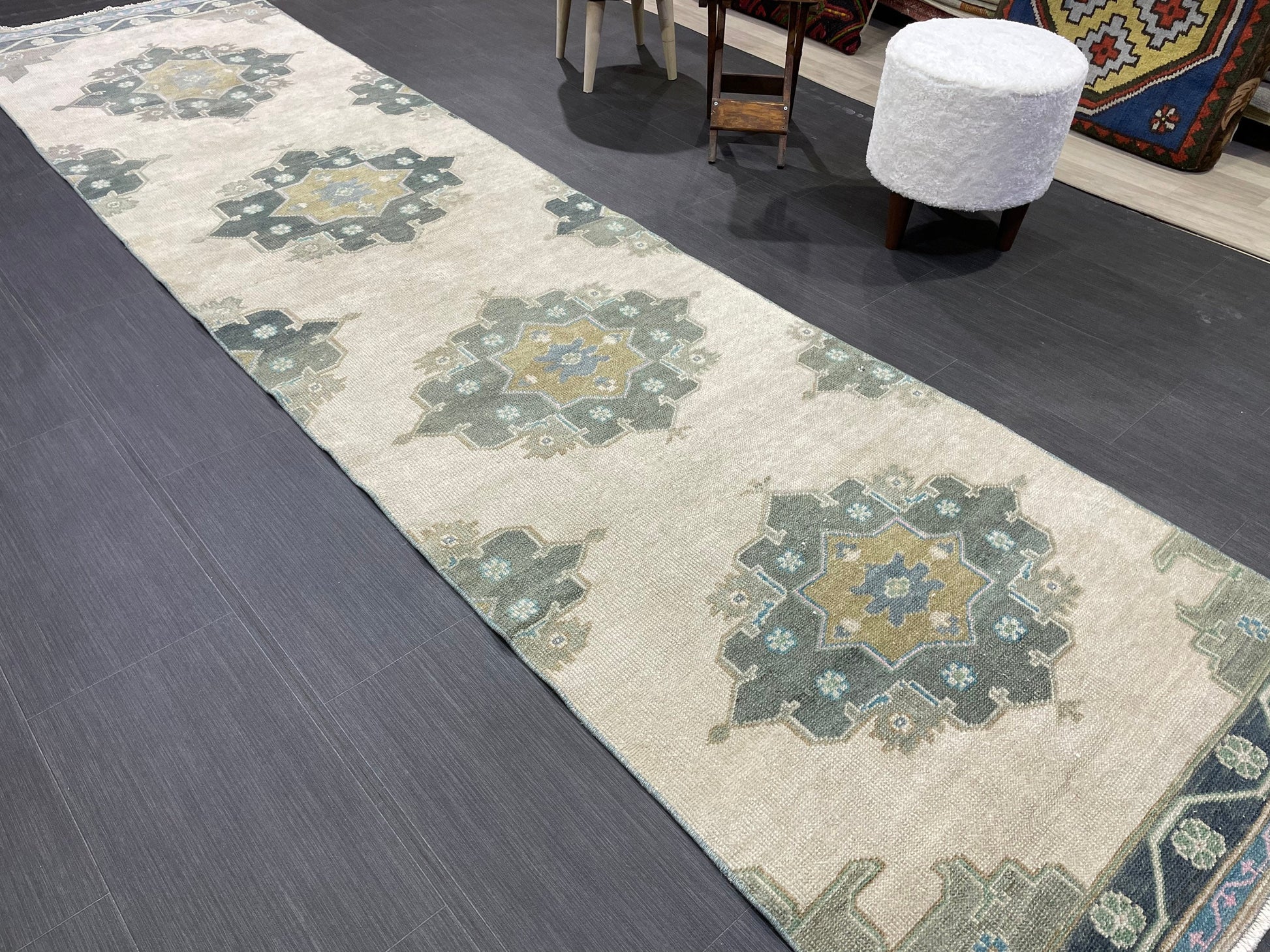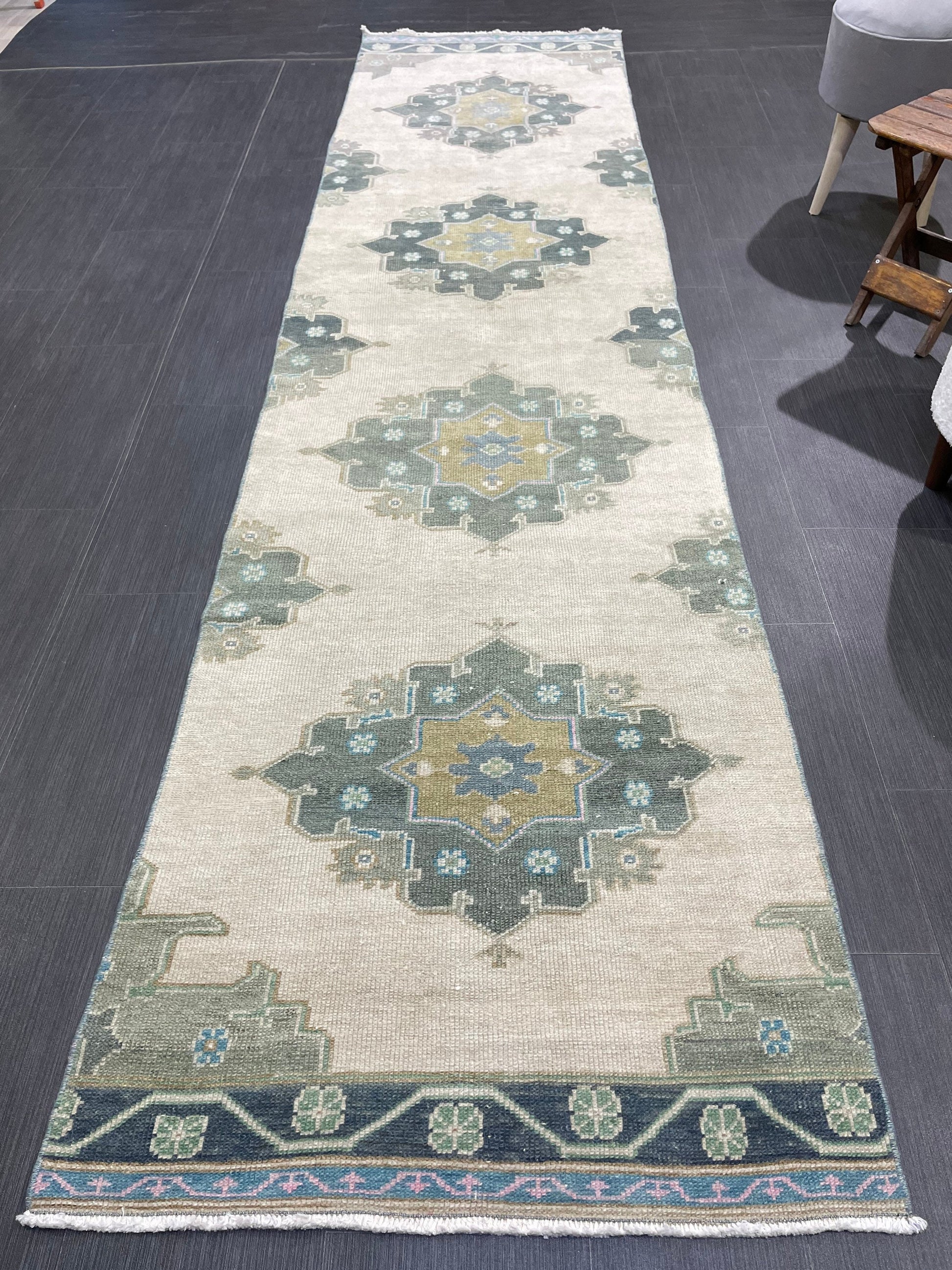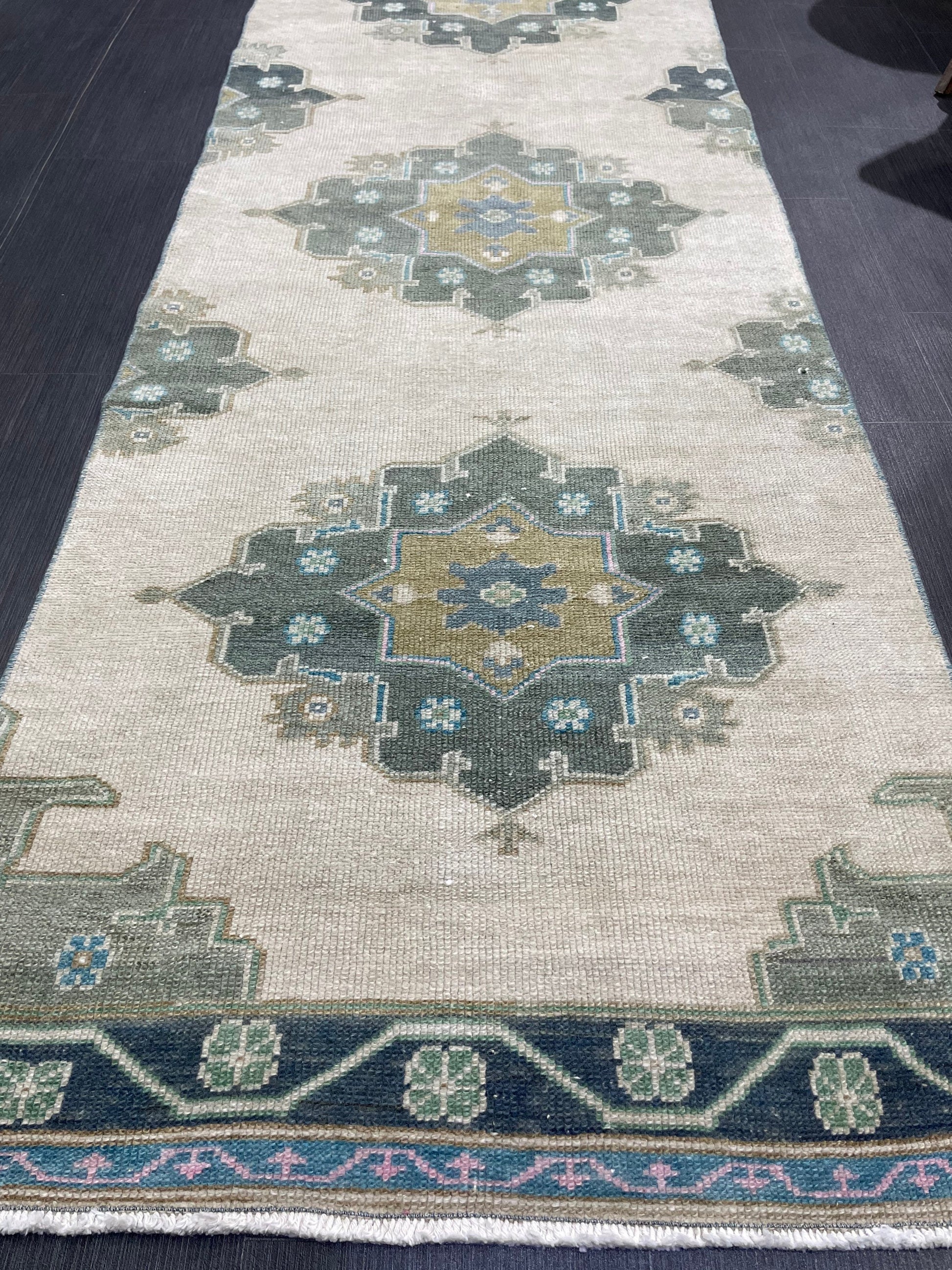 Muted Handmade Runner Rug Turkish Runner 2.7 x 11 Rug Vintage Runner Rug Hallway Runner Rug Kitchen Runner Rug Green Hand Knotted Runner