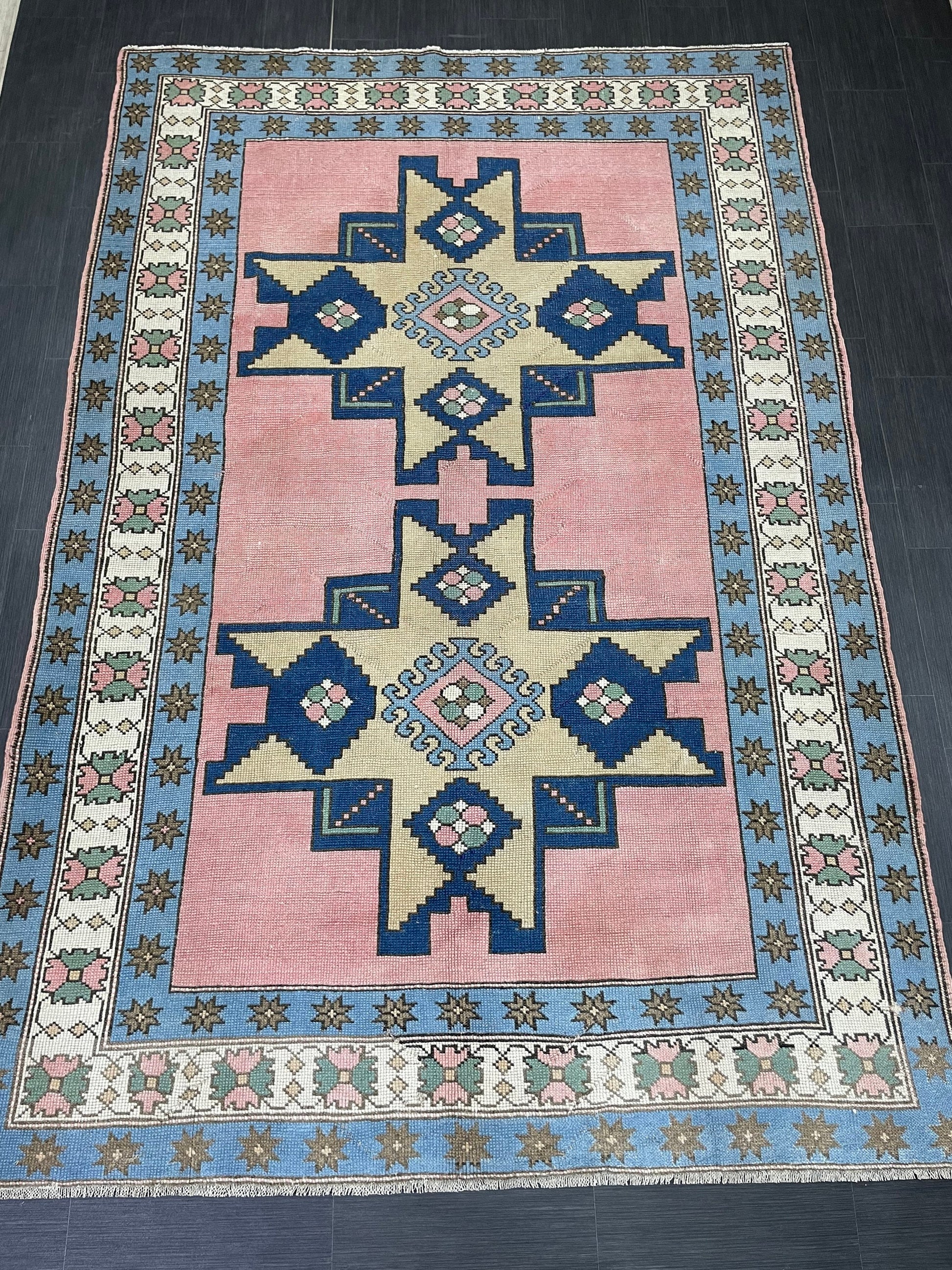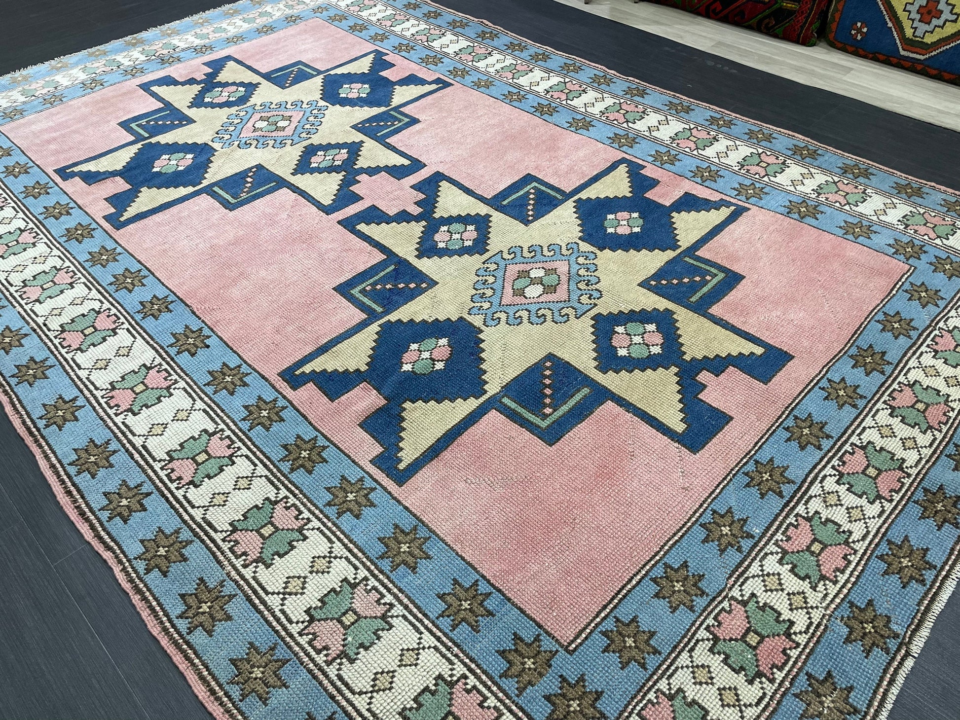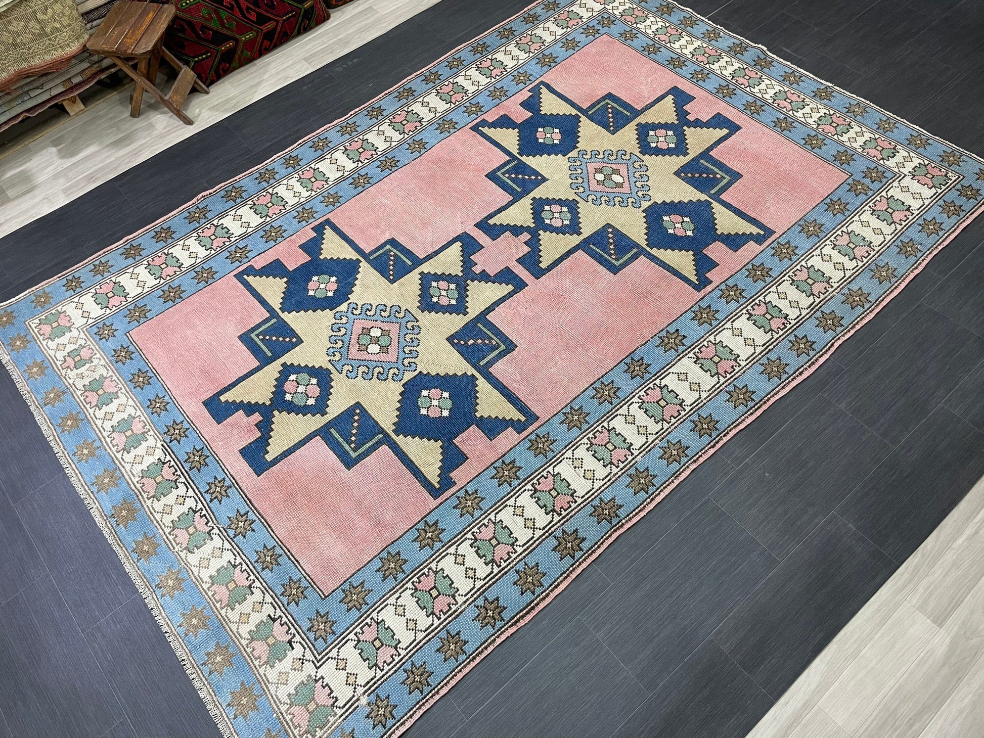 Turkish Rug Vintage 6.6 x 9.8 Rug Antique Rug Vintage Blue Pink Rug Wool
