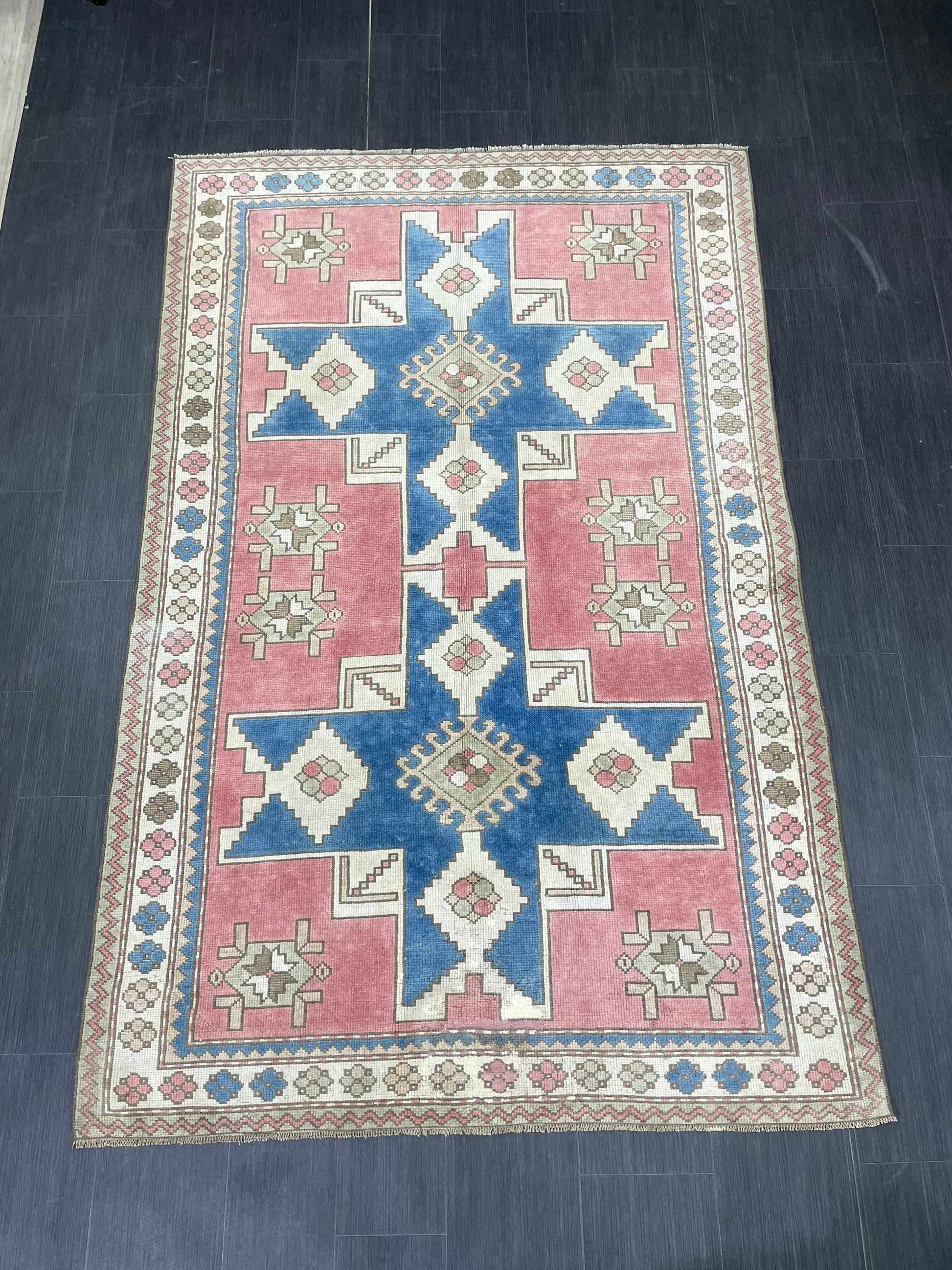 Vintage Blue and Pink Rug 5x8 Vintage Persian Rug Muted Vintage Rug Wool Muted Oushak Rug Hand Made Rugs Vintage Turkish Rug