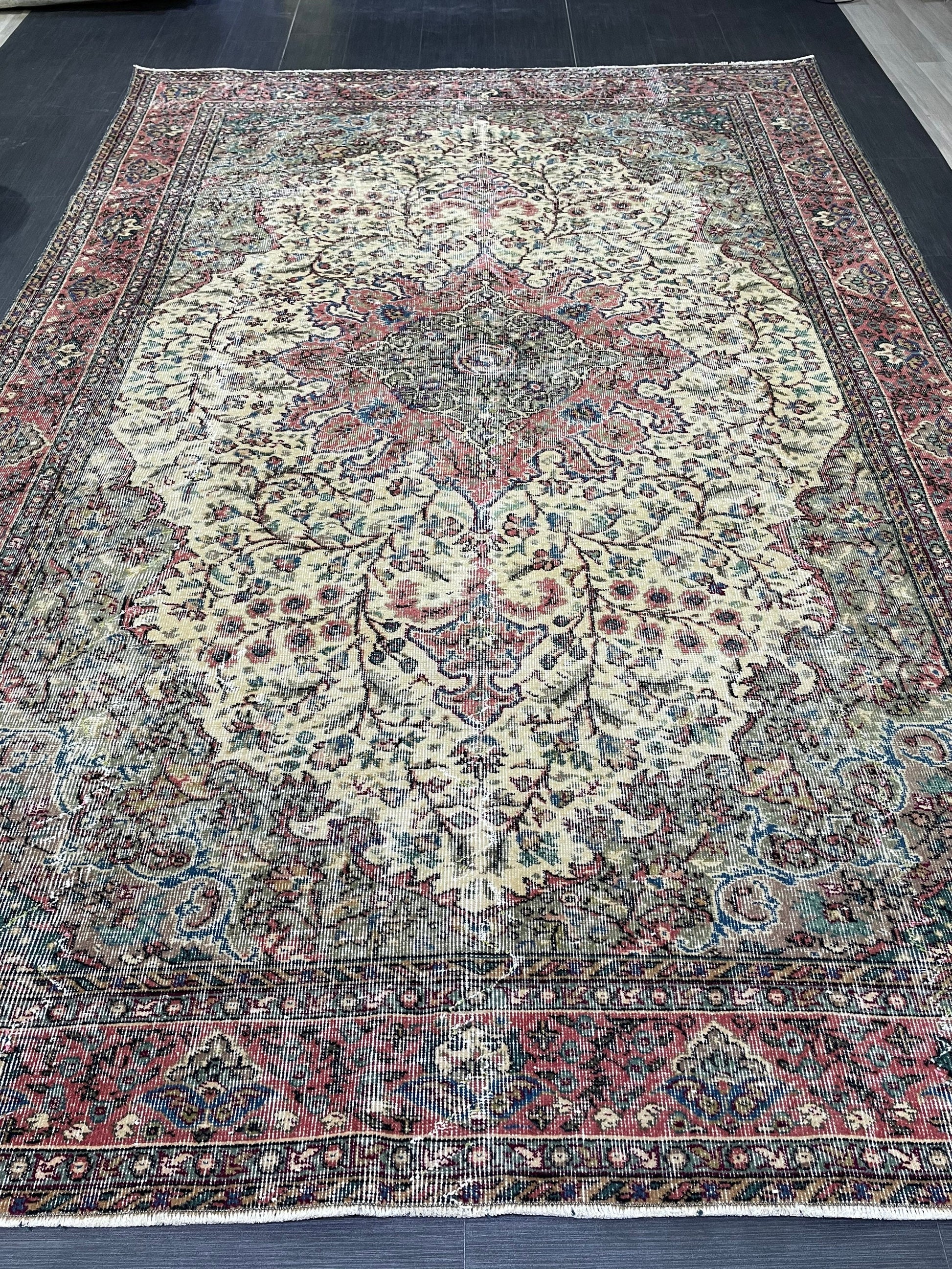 Vintage Rug, Persian Rug, Handmade Rug Muted Vintage 7 x 10.5 Rug, Hand Knotted Rug, Turkish Oushak Rug, Vintage Wool Turkish Rug