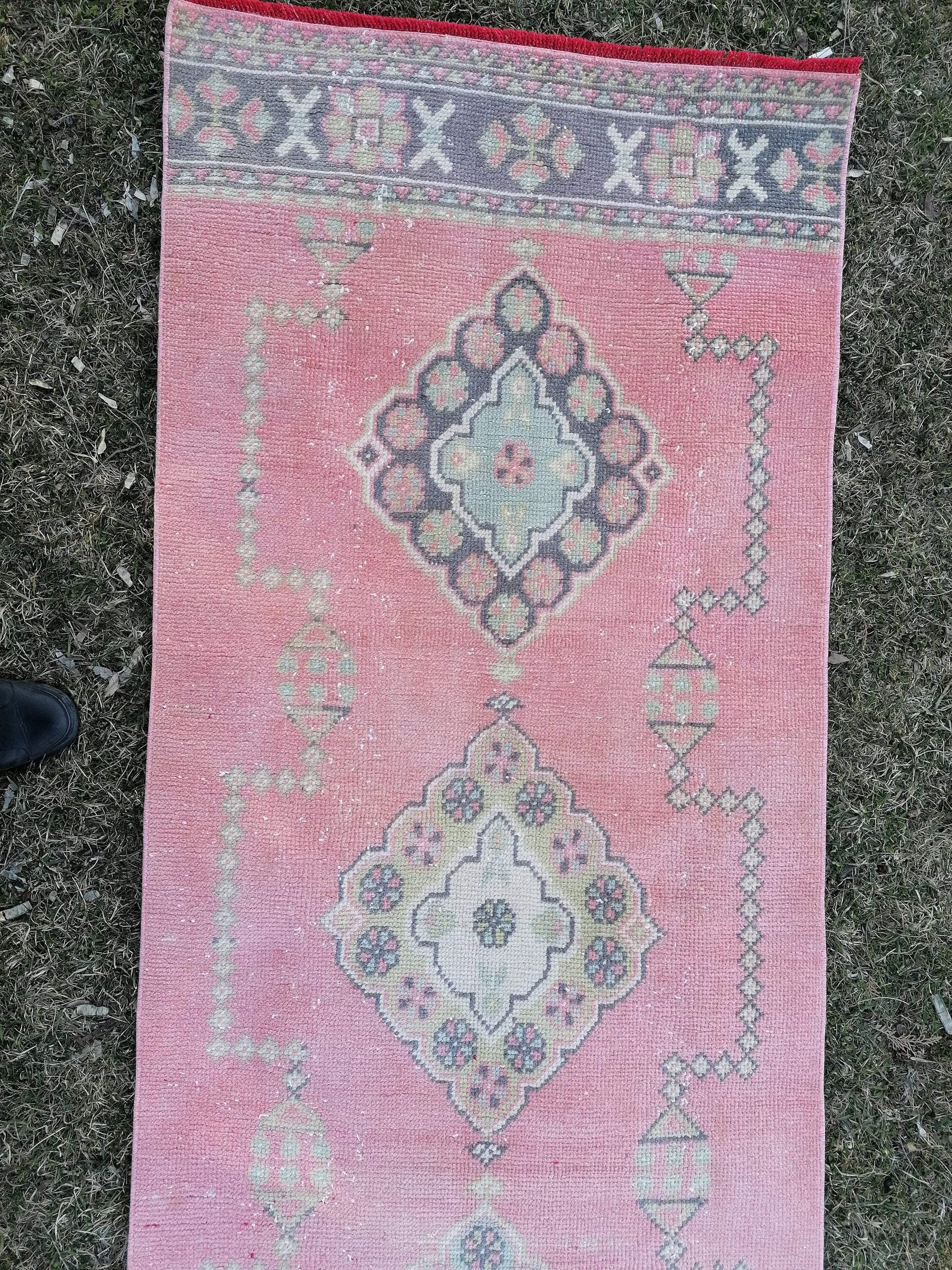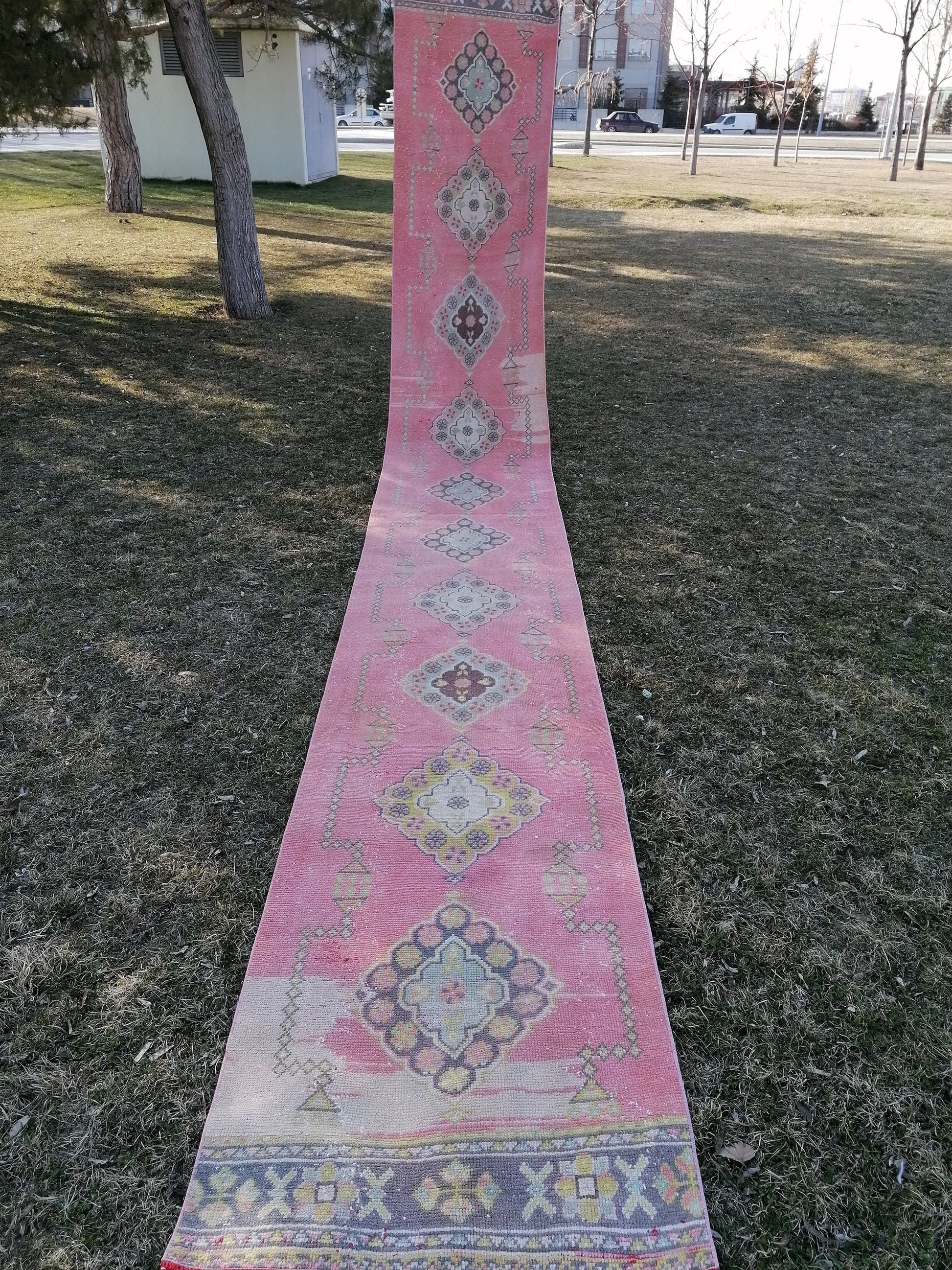 Vintage runner rug 2.10 x 22.10 pink extra long runner rug, oushak wool handmade runner