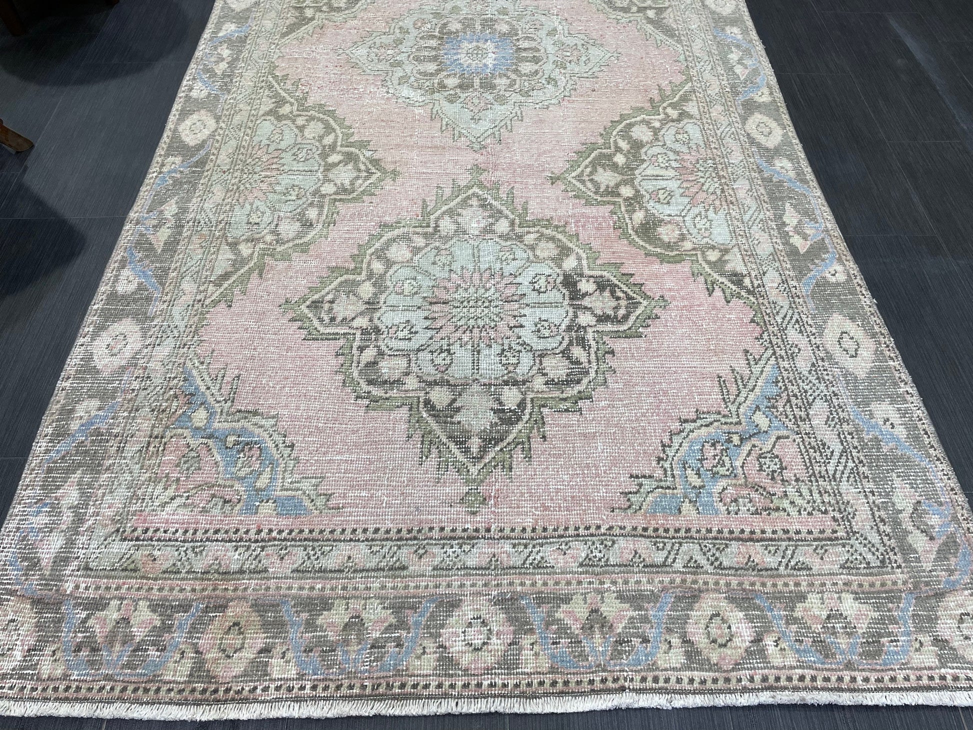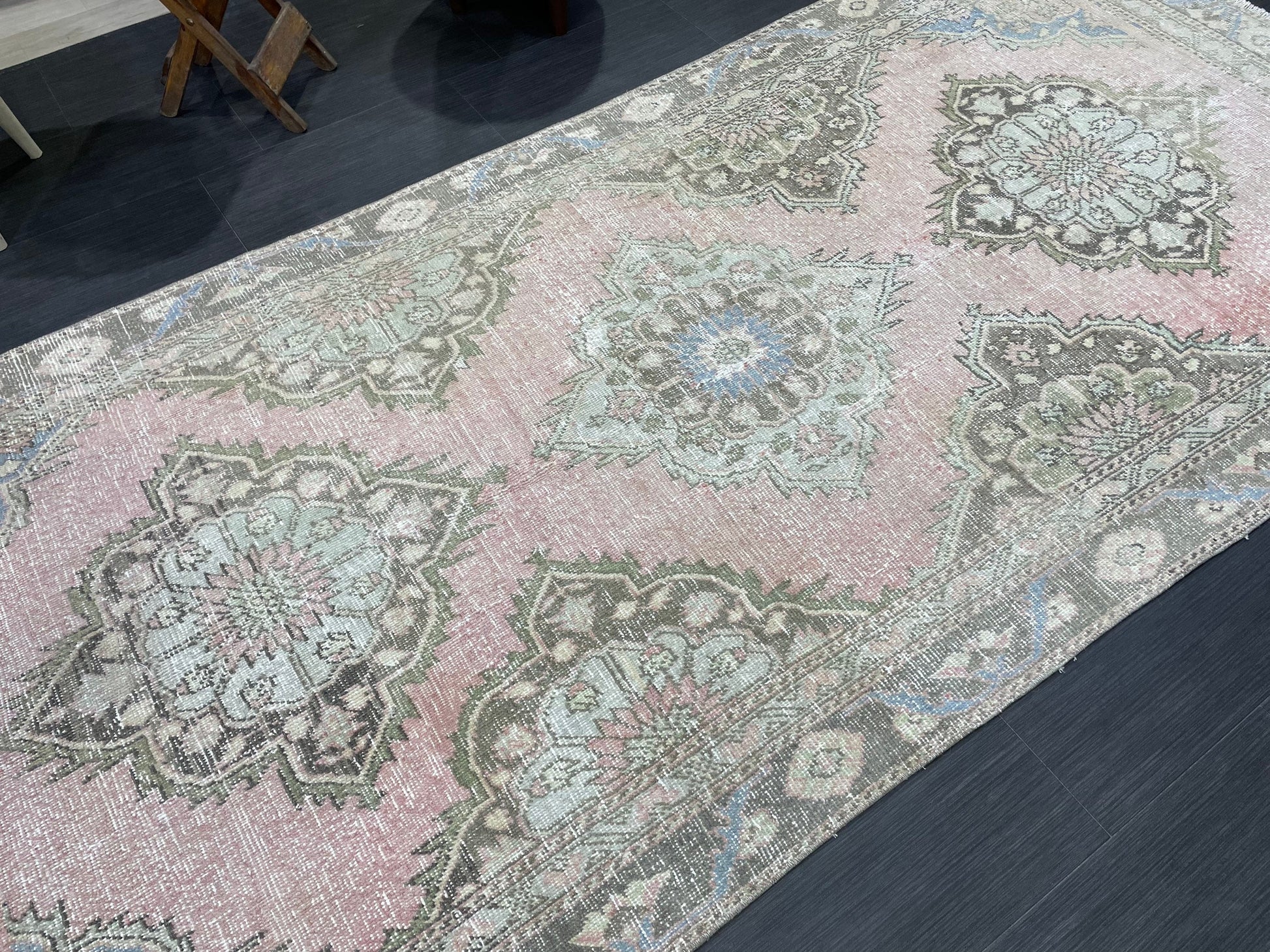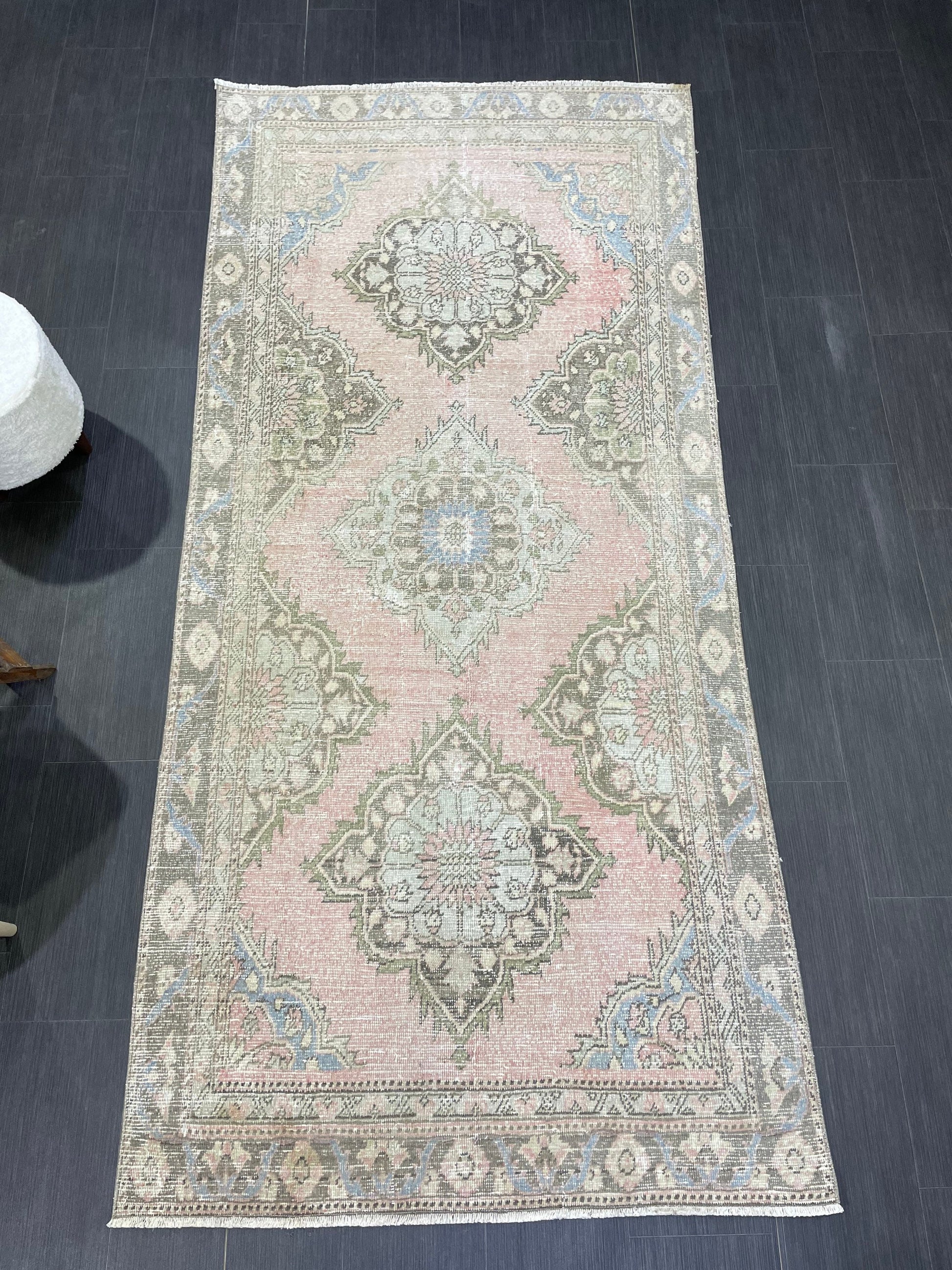 Vintage Runner Rug 4.3 x 9 Persian Runner Rug Wool Oushak Rug Oushak Runner Rug Turkish Runner Pink Kitchen Runner Distressed Hallway Runner