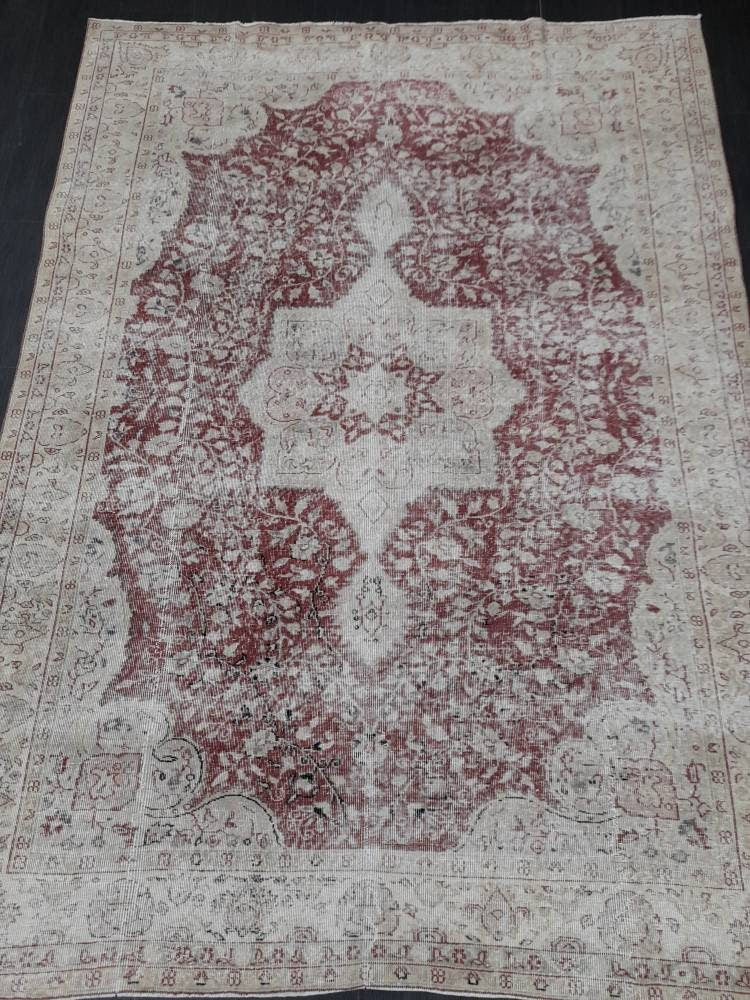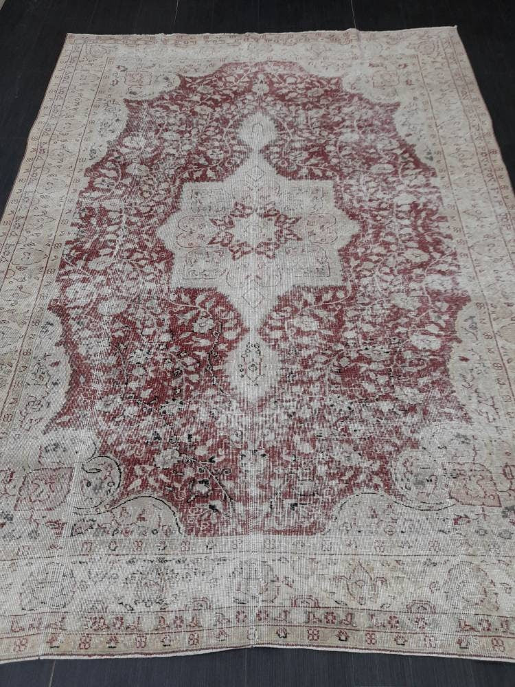 Vintage Turkish Rug 6.6 x 9 Oushak Rug Persian Rug Oriental Red Rug Muted Vintage Floral Rug Elegant Wool Rug Distressed HAND Knotted Rug