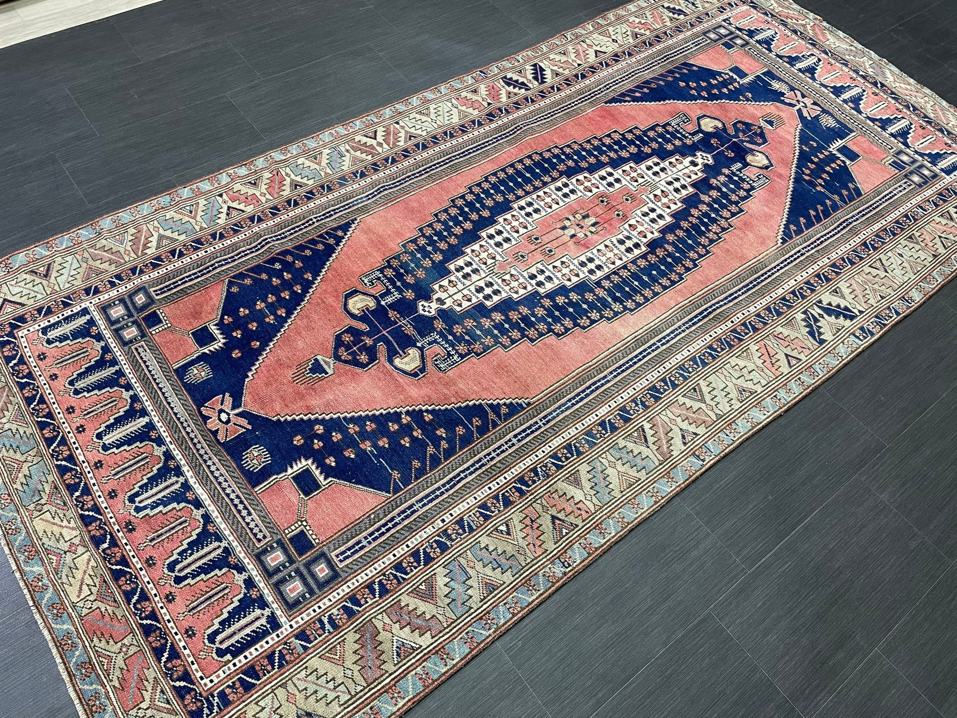 Wool OUSHAK RUG TURKISH 4.7 x 9.6 Rug Muted Pink and Navy Rug Vintage Oriental Rug Vintage Hand Made Rug Wool Vintage Oushak Rug 5x10