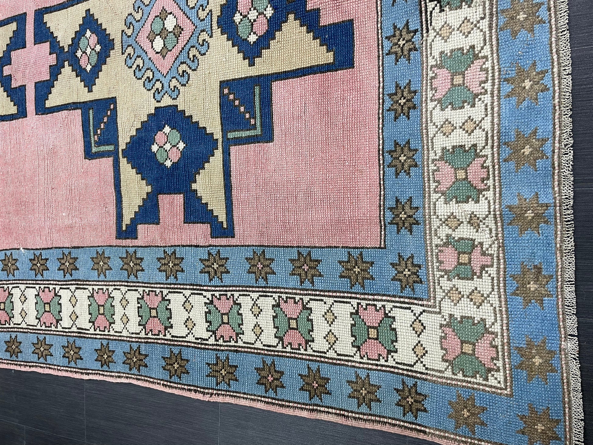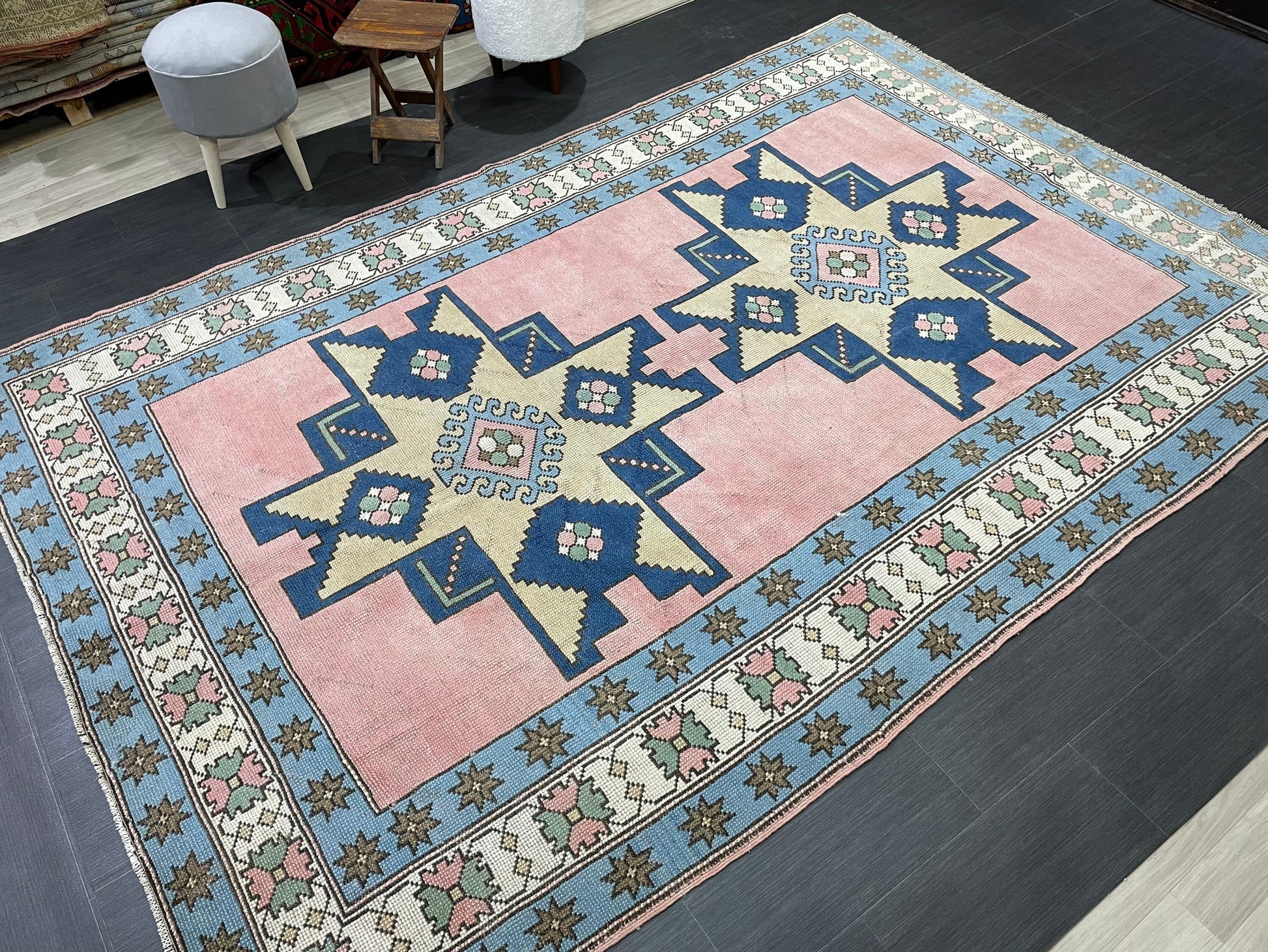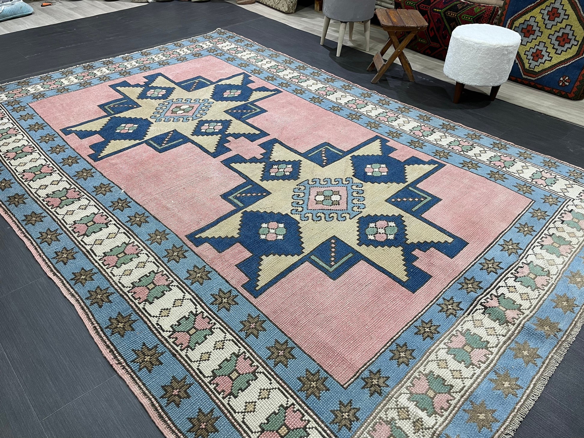 Wool OUSHAK RUG TURKISH 6.6 x 10 Rug Vintage Oriental Rug Vintage Handmade Rug Wool Vintage Pink and Blue Rug Hand Knotted Rug
