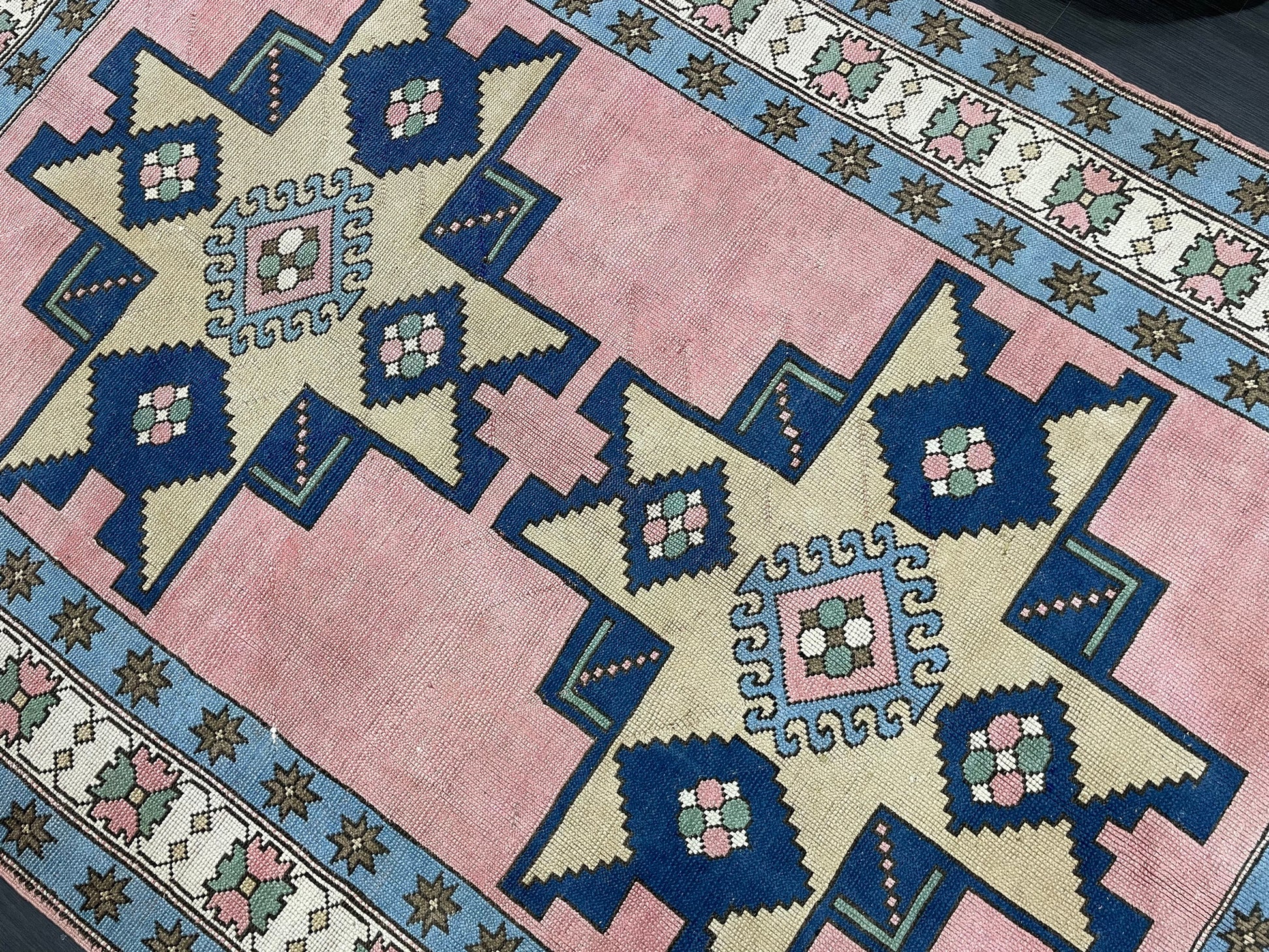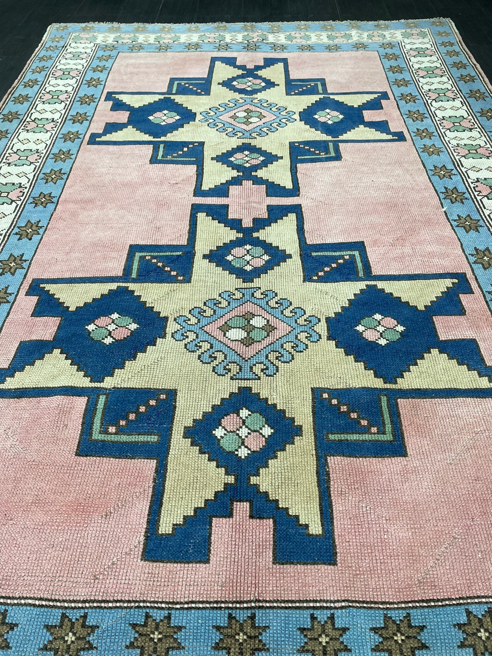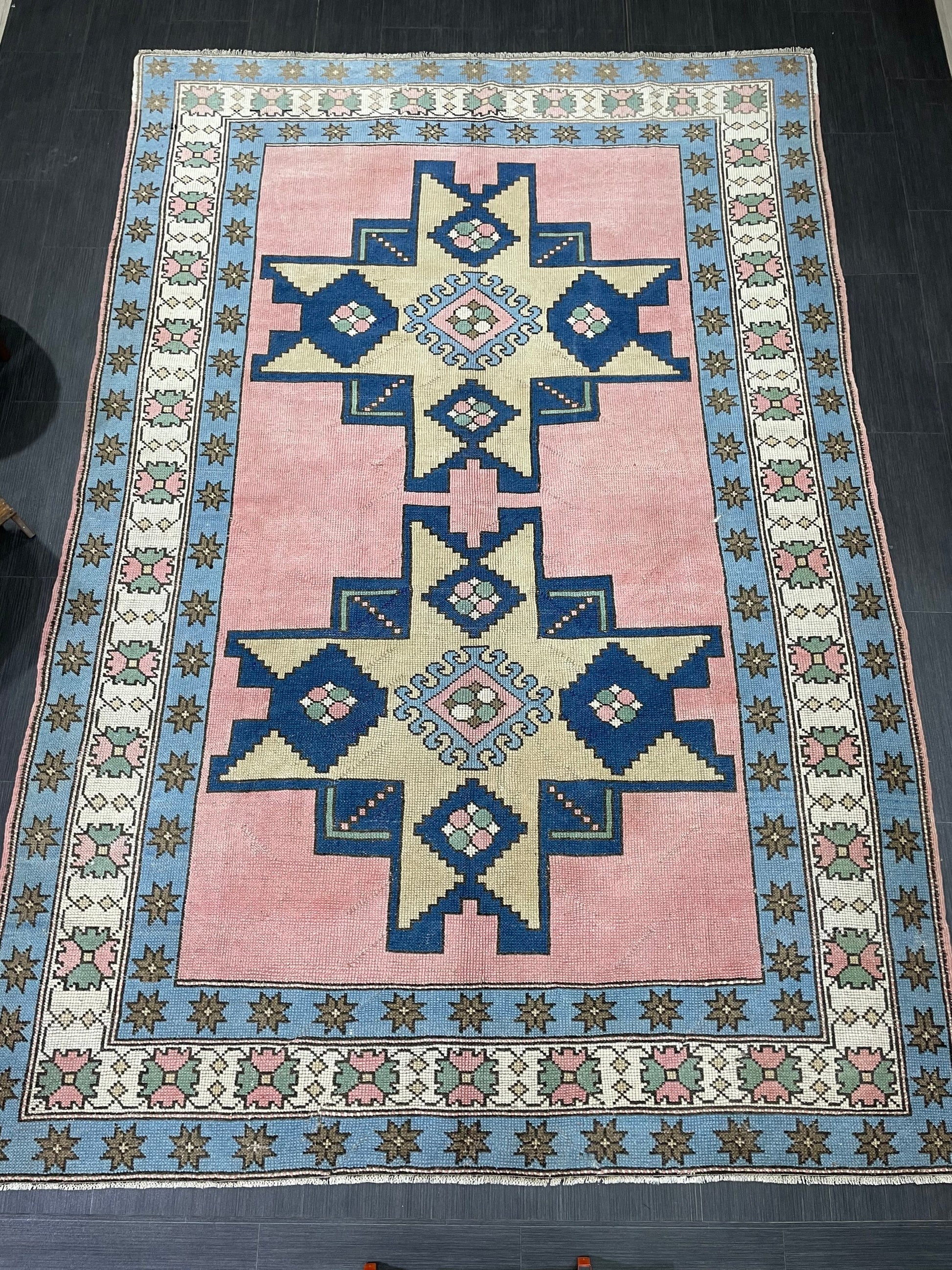 Wool OUSHAK RUG TURKISH 6.6 x 10 Rug Vintage Oriental Rug Vintage Handmade Rug Wool Vintage Pink and Blue Rug Hand Knotted Rug